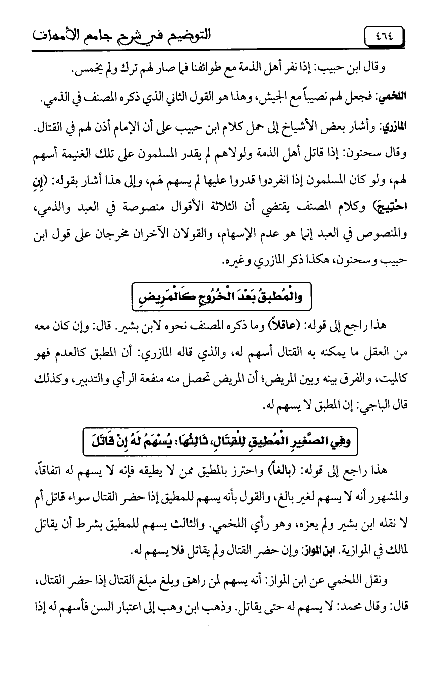 المازري: وأشار بعض الأشياخ إلى حمل كلام ابن حبيب على أن الإمام أذن لهم في القتال. وقال سحنون: إذا قاتل أهل الذمة ولولاهم لم يقدر المسلمون على تلك الغنيمة أسهم لهم، ولو كان المسلمون إذا انفردوا قدروا عليها لم يسهم لهم، وإلى هذا أشار بقوله: (إِنِ احْتِيجَ) وكلام المصنف يقتضي أن الثلاثة الأقوال منصوصة في العبد والذمي، والمنصوص في العبد إنما هو عدم الإسهام، والقولان الآخران مخرجان على قول ابن حبيب وسحنون، هكذا ذكر المازري وغيره.