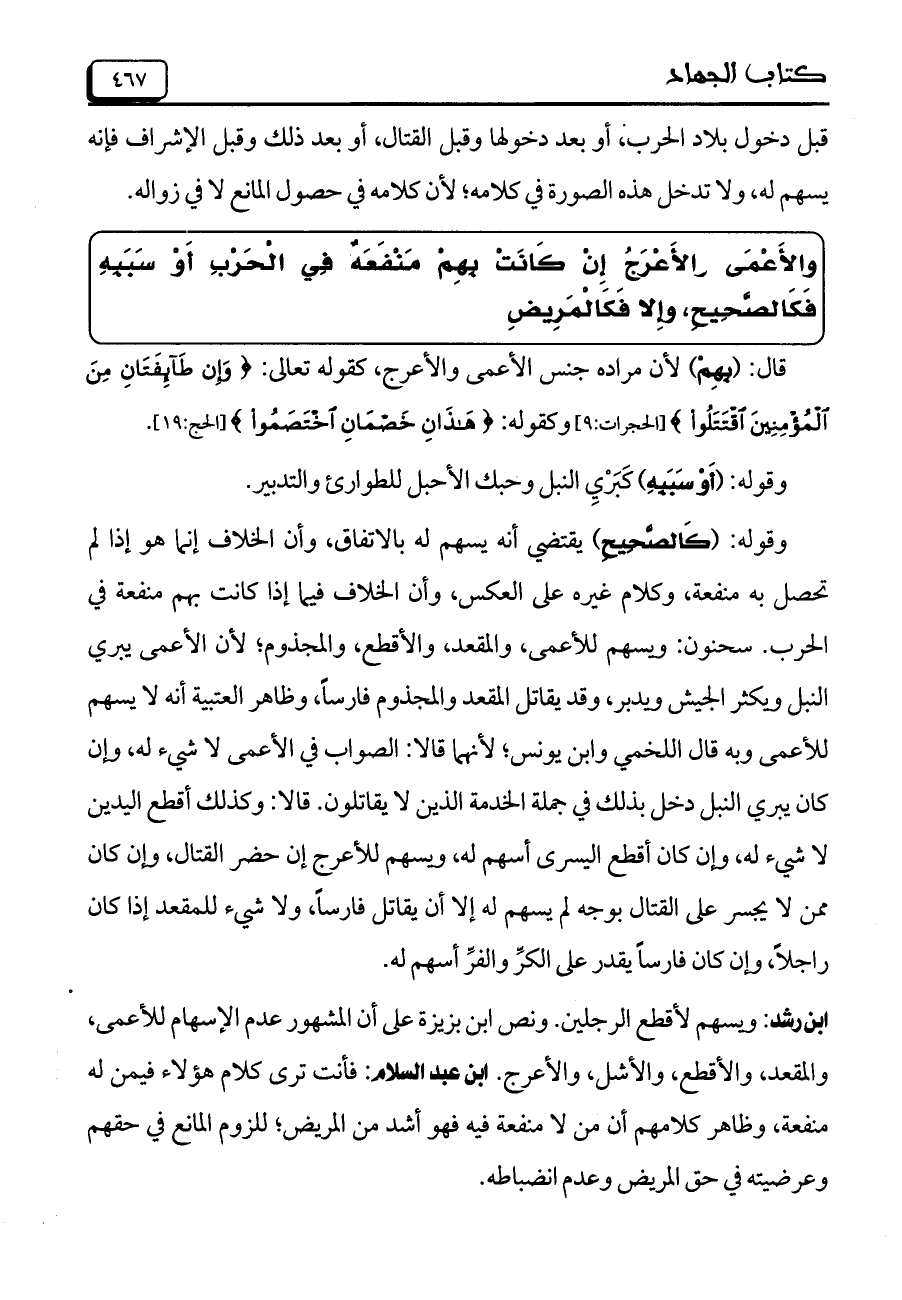 ابن رشد: ويسهم لأقطع الرجلين. ونص ابن بزيزة على أن المشهور عدم الإسهام للأعمى، والمقعد، والأقطع، والأشل، والأعرج. ابن عبد السلام: فأنت ترى كلام هؤلاء فيمن له منفعة، وظاهر كلامهم أن من لا منفعة فيه فهو أشد من المريض؛ للزوم المانع في حقهم وعرضيته في حق المريض وعدم انضباطه.