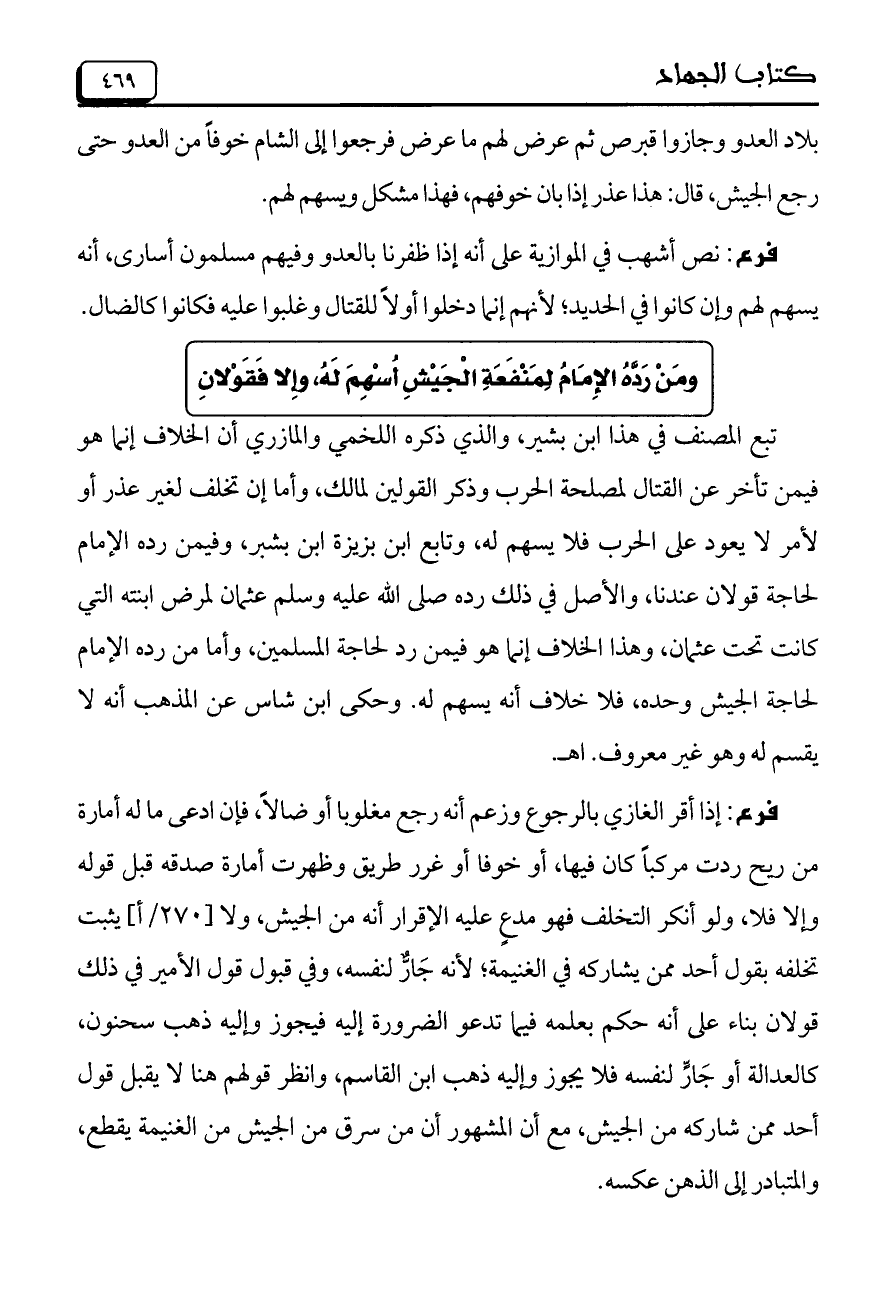 تبع المصنف في هذا ابن بشير، والذي ذكره اللخمي والمازري أن الخلاف إنما هو فيمن تأخر عن القتال لمصلحة الحرب وذكر القولين لمالك، وأما إن تخلف لغير عذر أو لأمر لا يعود على الحرب فلا يسهم له، وتابع ابن بزيزة ابن بشير، وفيمن رده الإمام لحاجة قولان عندنا، والأصل في ذلك رده صلى الله عليه وسلم عثمان لمرض ابنته التي كانت تحت عثمان، وهذا الخلاف إنما هو فيمن رد الحاجة المسلمين، وأما من رده الإمام لحاجة الجيش وحده، فلا خلاف أنه يسهم له. وحكى ابن شاس عن المذهب أنه لا يقسم له وهو غير معروف. أهـ.