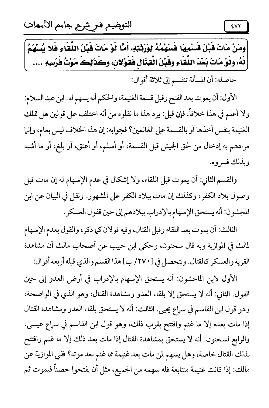 الثالث: أن يموت بعد اللقاء وقبل القتال، وفيه قولان كما ذكر، والقول بعدم الإسهام لمالك في الموازية وبه قال سحنون، وحكى ابن حبيب عن أصحاب مالك أن مشاهدة القرية والعسكر كالقتال. ويتحصل في [270/ ب] هذا القسم والذي قبله أربعة أقوال:
