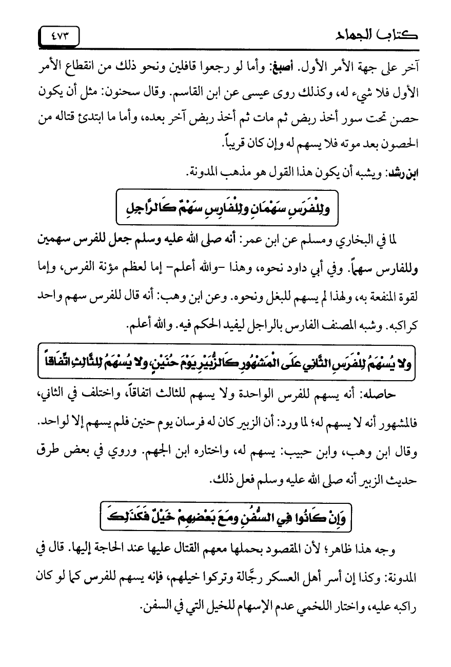 ولِلْفَرَسِ سَهْمَانِ ولِلْفَارِسِ سَهْمُ كاَلرَّاجِلِ