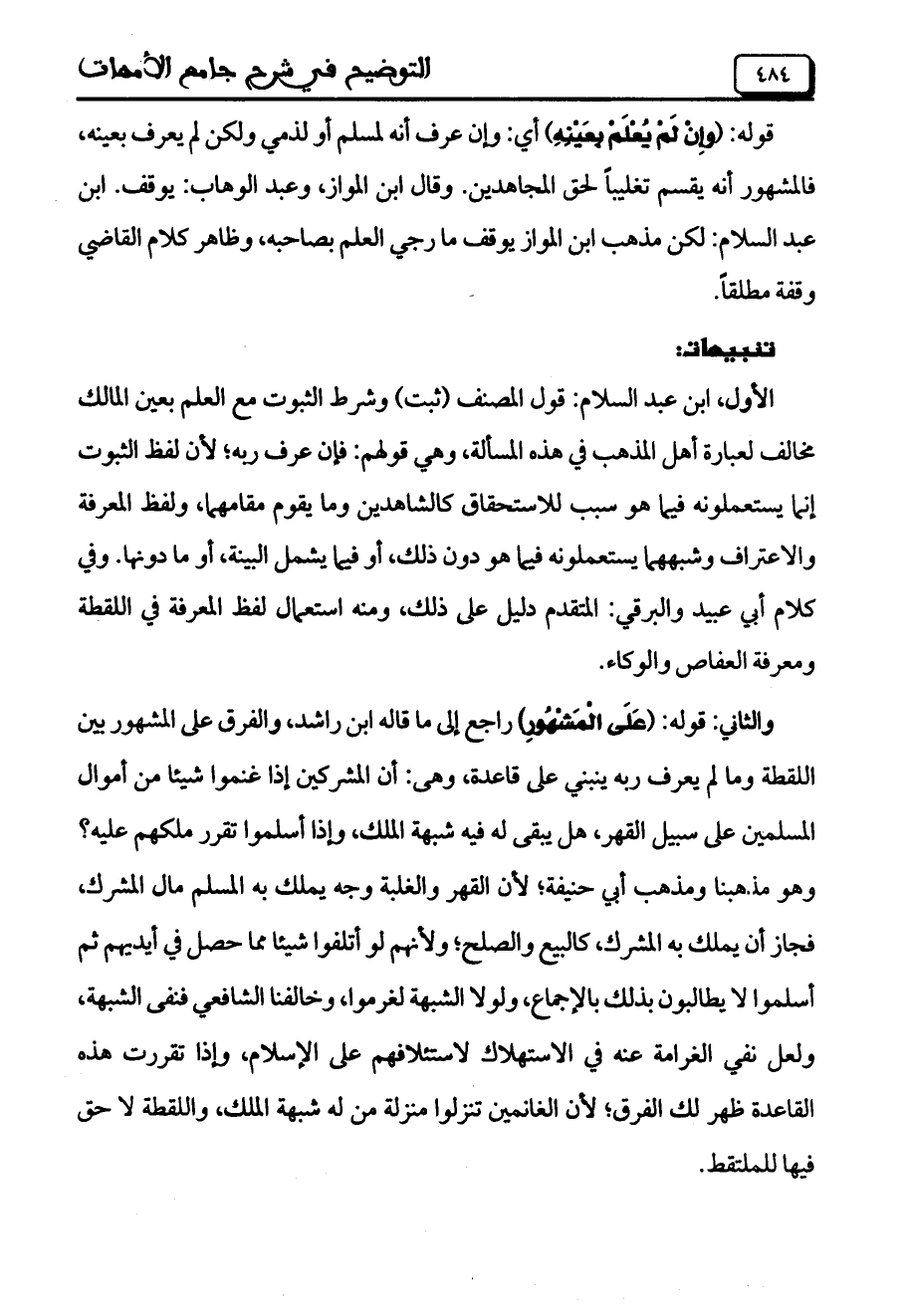 الأول: ابن عبد السلام: قول المصنف (ثبت) وشرط الثبوت مع العلم بعين المالك مخالف لعبارة أهل المذهب في هذه المسألة، وهي قولهم: فإن عرف ربه؛ لأن لفظ الثبوت إنما يستعملونه فيما هو سبب للاستحقاق كالشاهدين وما يقوم مقامهما، ولفظ المعرفة والاعتراف وشبههما يستعملونه فيما هو دون ذلك، أو فيما يشمل البينة، أو ما دونها. وفي كلام أبي عبيد والبرقي: المتقدم دليل على ذلك، ومنه استعمال لفظ المعرفة في اللقطة ومعرفة العفاص والوكاء.