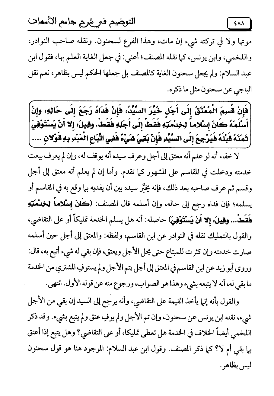 لا خفاء أنه لو علم أنه معتق إلى أجل وعرف سيده أنه يوقف له، وإن لم يعرف بيعت خدمته ودخلت في المقاسم على المشهور كما تقدم. وأما إن لم يعلم أنه معتق إلى أجل وقسم ثم عرف صاحبه بعد ذلك، فإنه يخير سيده بين أن يفديه بما وقع به في المقاسم أو يسلمه؛ فإن فداه رجع إلى حاله، وإن أسلمه قال المصنف: (كَانَ إِسْلاماً لِخِدْمَتِهِ فَقَطْ ... وقِيلَ: إِلا أَنْ يَسْتَوْفِيَ) حاصله: أنه هل يسلم الخدمة تمليكاً أو على التقاضي، والقول بالتمليك نقله في النوادر عن ابن القاسم، ولفظه: والمعتق إلى أجل حين أسلمه صارت خدمته وإن كثرت للمبتاع حتى يحل الأجل ويعتق، فإن بقي له شيء أتبع به، قال: وروى أبو زيد عن ابن القاسم في المعتق إلى أجل يتم الأجل ولم يستوف المشتري من الخدمة ما بقي له، أنه لا يتبعه بشيء وهذا هو الصواب، ورجوع منه عن قوله الأول. انتهى.