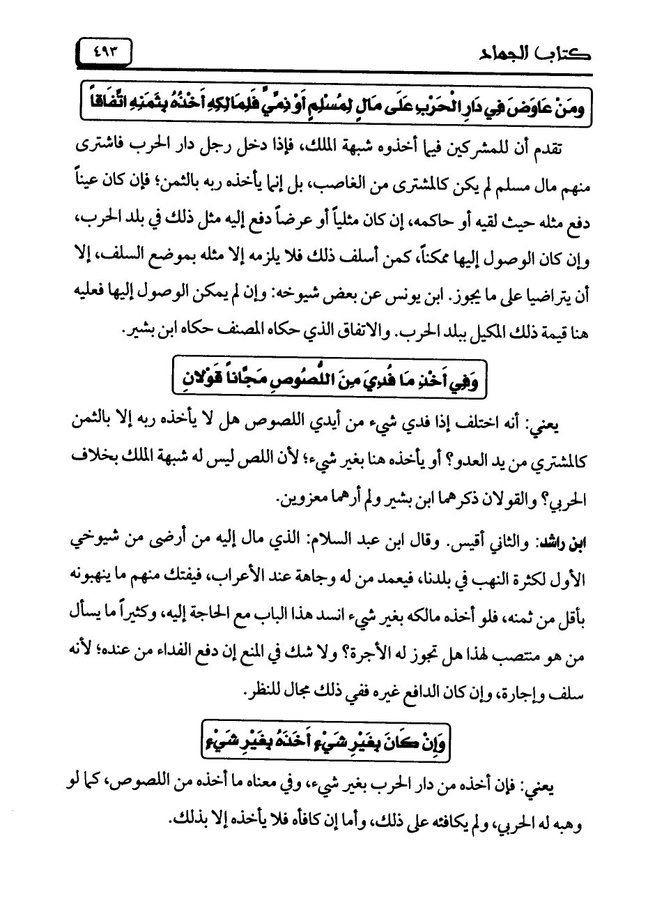ابن راشد: والثاني أقيس. وقال ابن عبد السلام: الذي مال إليه من أرضي من شيوخي الأول لكثرة النهب في بلدنا، فيعمد من له وجاهة عند الأعراب، فيفتك منهم ما ينهبونه بأقل من ثمنه، فلو أخذه مالكه بغير شيء انسد هذا الباب مع الحاجة إليه، وكثيراً ما يسأل من هو منتصب لهذا هو تجوز له الأجرة؟ ولا شك في المنع إن دفع الفداء من عنده؛ لأنه سلف وإجارة، وإن كان الدافع غيره ففي ذلك مجال للنظر.