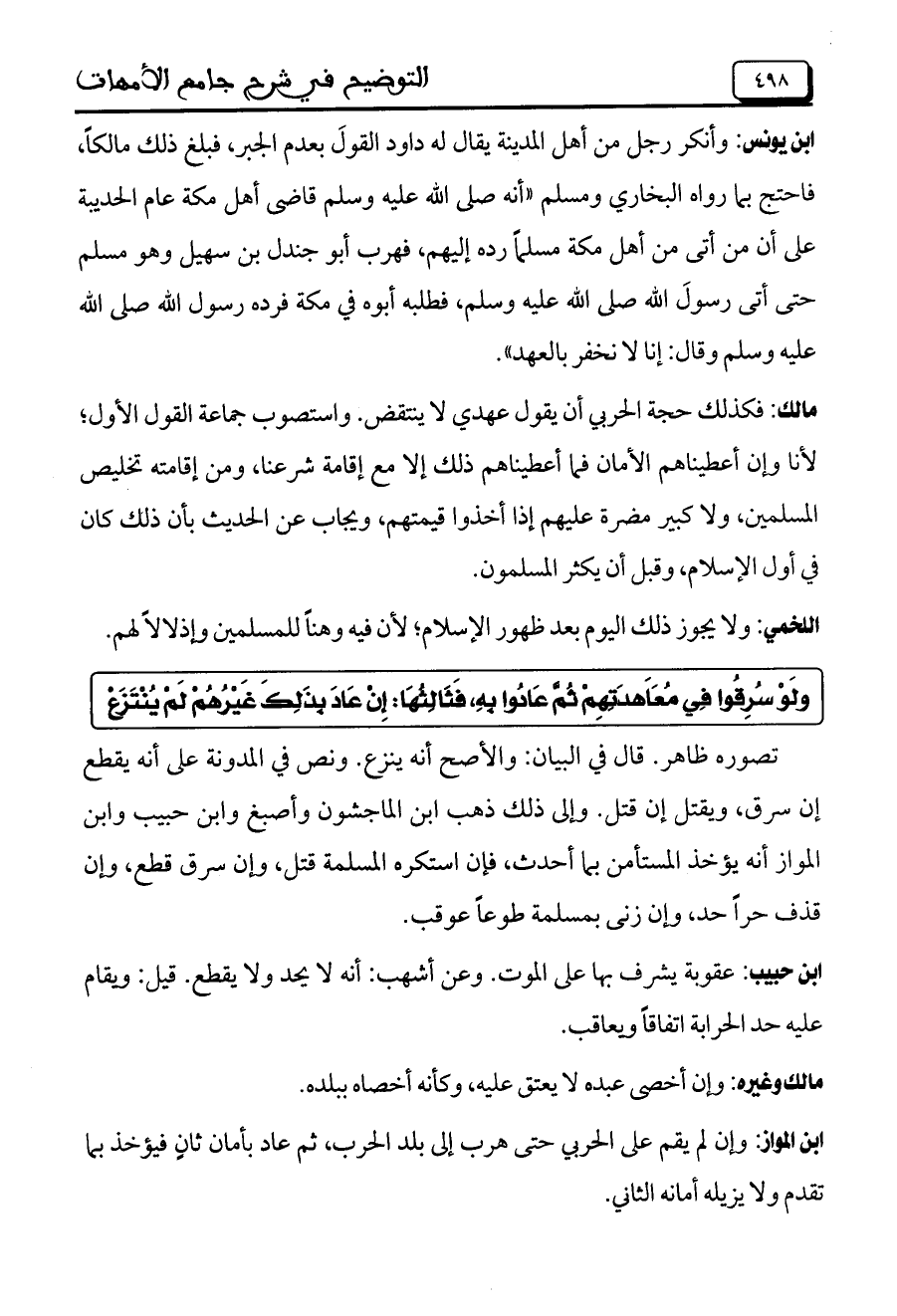 ابن يونس: وأنكر رجل من أهل المدينة يقال له داود القول بعدم الجبر، فبلغ ذلك مالكاً، فاحتج بما رواه البخاري ومسلم "أنه صلى الله عليه وسلم قاضي أهل مكة عام الحديبة على أن من أتى من أهل مكة مسلماً رده إليهم، فهرب أبو جندل بن سهيل وهو مسلم حتى أتى رسول الله صلى الله عليه وسلم، فطلبه أبوه في مكة فرده رسول الله صلى الله عليه وسلم وقال: إنا لا نخفر بالعهد".
