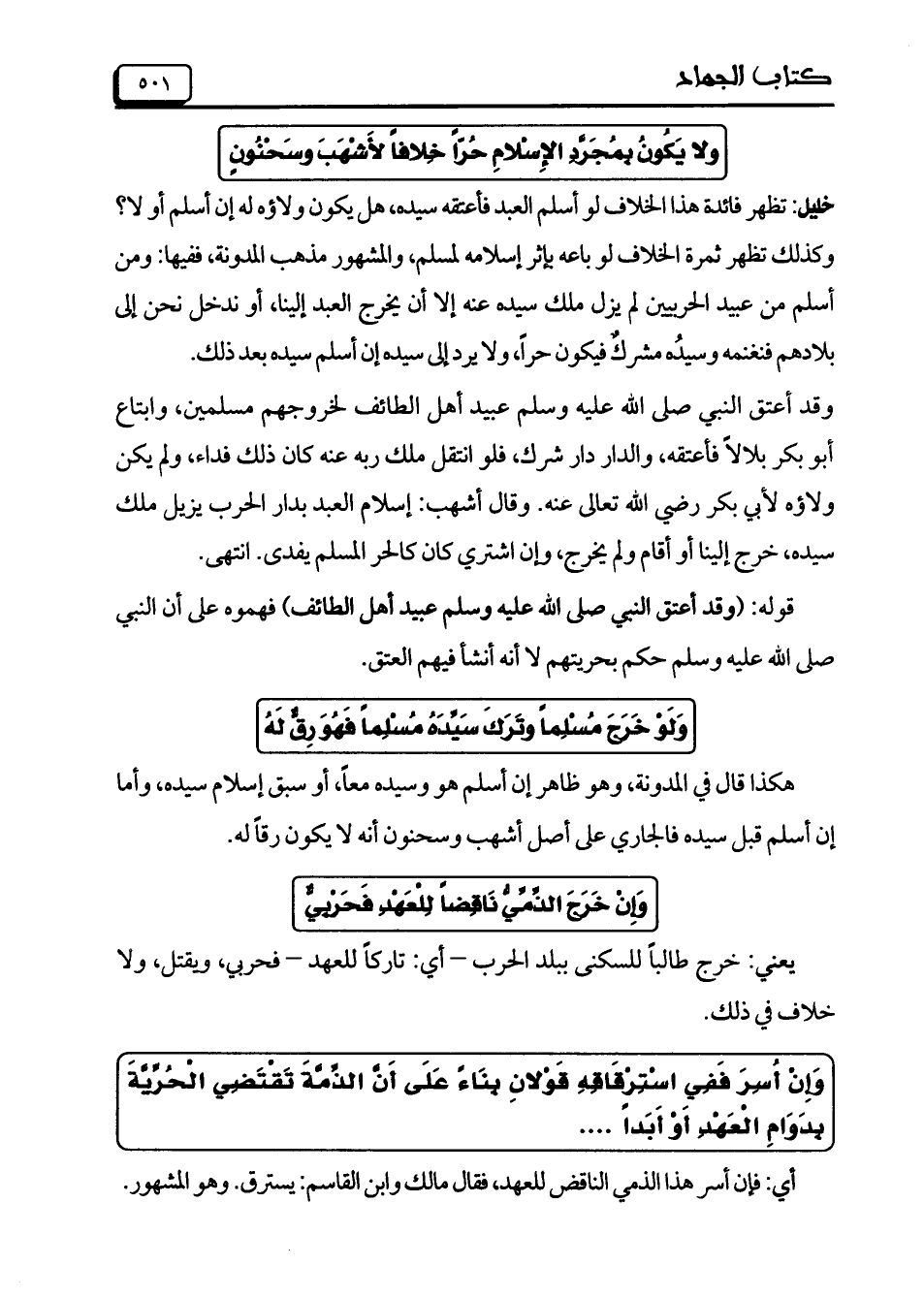 ولا يَكُونُ بِمُجَرَّدِ الإِسْلامِ حُرّاً خِلافاً لأَشْهَبَ وسَحْنُونٍ