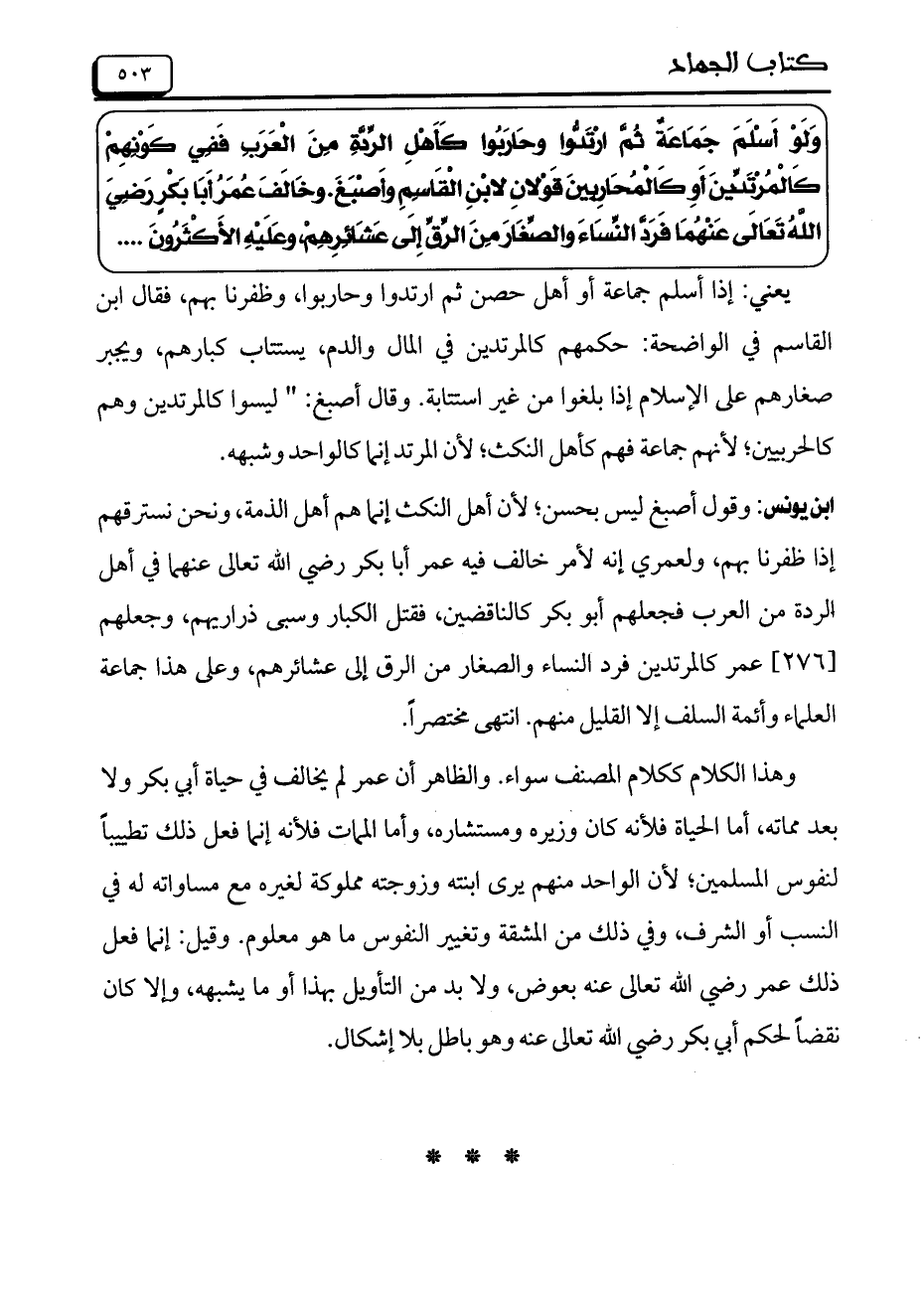وَلَوْ أَسْلَمَ جَمَاعَةٌ ثُمَّ ارْتَدُّوا وحَارَبُوا كَأَهْلِ الرِّدَّةِ مِنَ الْعَرَبِ فَفِي كَوْنِهِمْ كَالْمُرْتَدِّينَ أَوِ كَالْمُحَارِبِينَ قَوْلانِ لابْنِ الْقَاسِمِ وأَصْبَغَ. وخَالَفَ عُمَرُ أَبَا بَكْرٍ رَضِيَ اللهُ تَعَالَى عَنْهُمَا فَرَدَّ النِّسَاءَ والصِّغَارَ مِنَ الرِّقِّ إِلَى عَشَائِرِهِمْ، وعَلَيْهِ الأَكْثَرُونَ .....