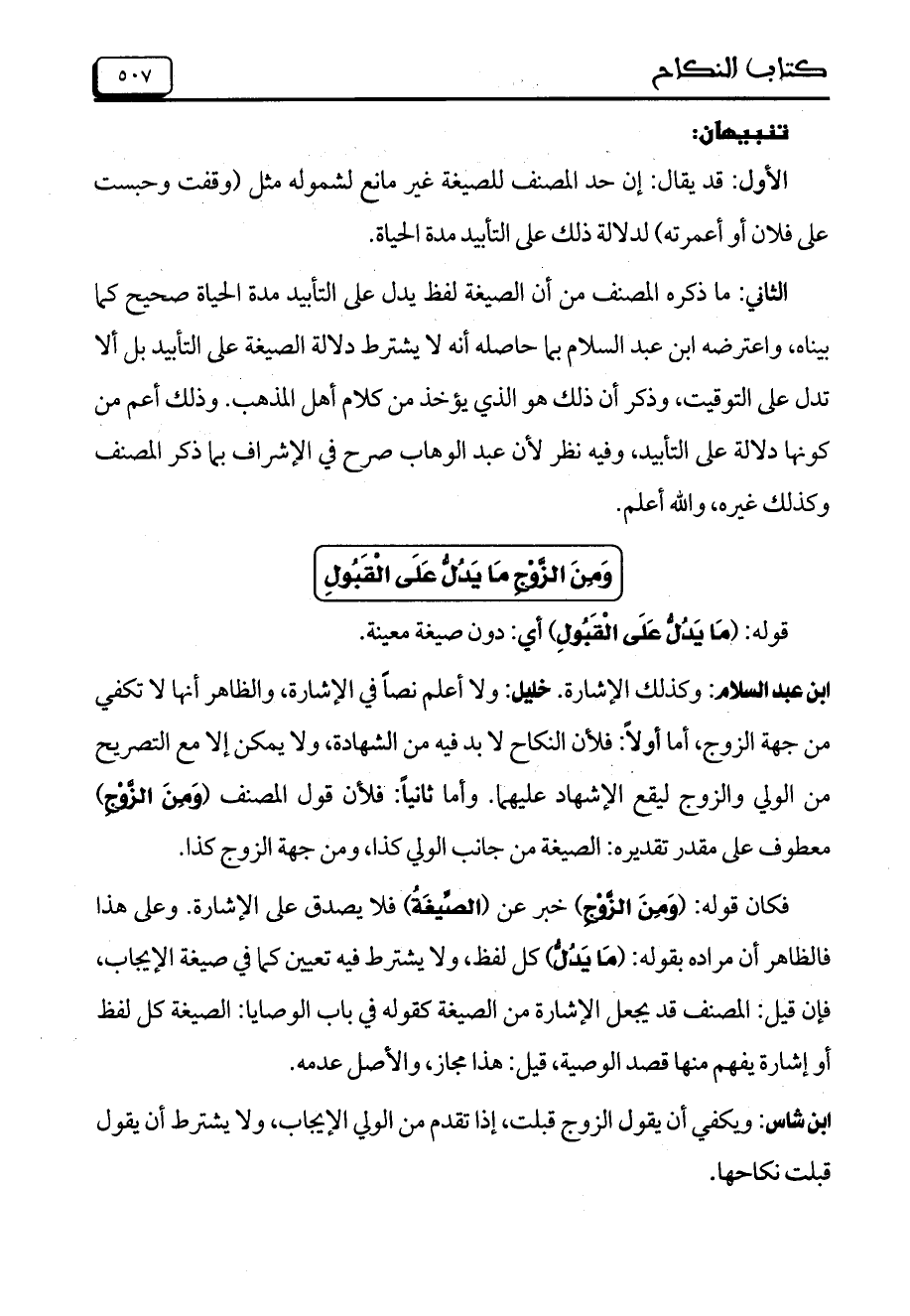 ابن عبد السلام: وكذلك الإشارة. خليل: ولا أعلم نصاً في الإشارة، والظاهر أنها لا تكفي من جهة الزوج، أما أولاً: فلأن النكاح لابد فيه من الشهادة، ولا يمكن إلا مع التصريح من الولي والزوج ليقع الإشهاد عليهما. وأما ثانياً: فلأن قول المصنف (وَمِنَ الزَّوْجِ) معطوف على مقدر تقديره: الصيغة من جانب الولي كذا، ومن جهة الزوج كذا.