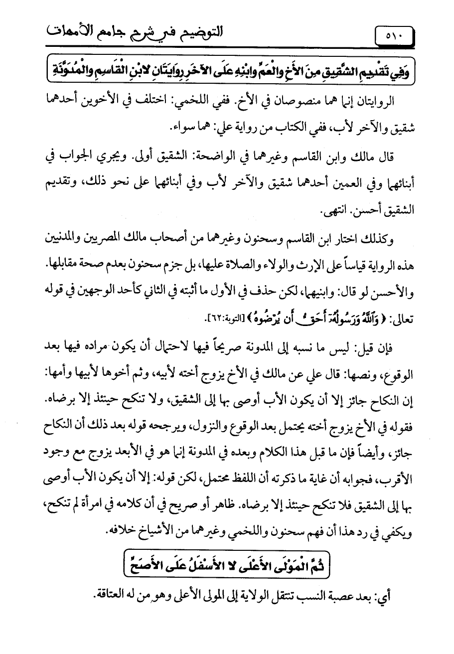 وَفِي تَقْدِيمِ الشَّقِيقِ مِنَ الأَخِ والْعَمِّ وابْنِهِ عَلَى الآخَرِ رِوَايَتَانِ لابْنِ الْقَاسِمِ والْمُدَوَنَّةِ
