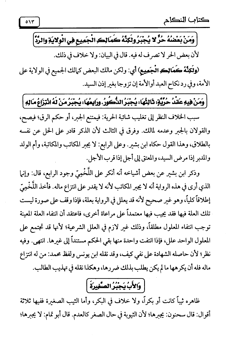 وَمَنْ فِيهِ عَقْدُ حُرِّيَّةٍ: ثَالِثُهَا: يُجْبَرُ الذُّكُورُ. ورَابعُها: يُجْبَرُ مِنْ لَهُ انْتِزَاعُ مَالِهِ