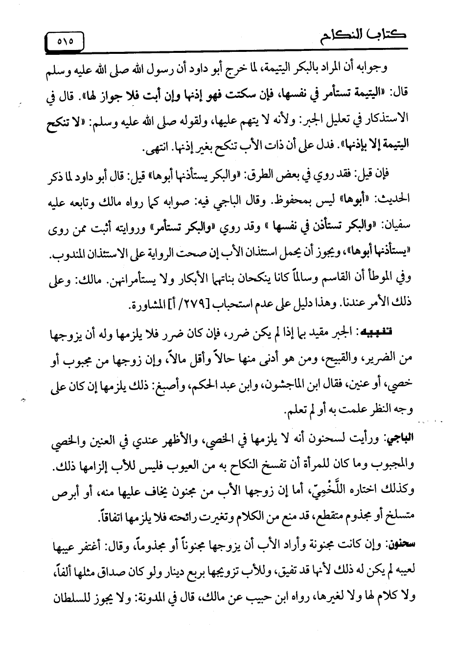 فإن قيل: فقد روي في بعض الطرق: "والبكر يستأذنها أبوها" قيل: قال أبو داود لما ذكر الحديث: "أبوها" ليس بمحفوظ. وقال الباجي فيه: صوابه كما رواه مالك وتابعه عليه سفيان: "والبكر تستأذن في نفسها" وقد روي "والبكر تستأمر" وروايته أثبت ممن روى "يستأذنها أبوها"، ويجوز أن يحمل استئذان الأب إن صحت الرواية على الاستئذان المندوب وفي الموطأ أن القاسم وسالماً كانا ينكحان بناتهما الأبكار ولا يستأمرانهن. مالك: وعلى ذلك الأمر عننا. وهذا دليل على عدم استحباب [279/ أ] المشاورة.