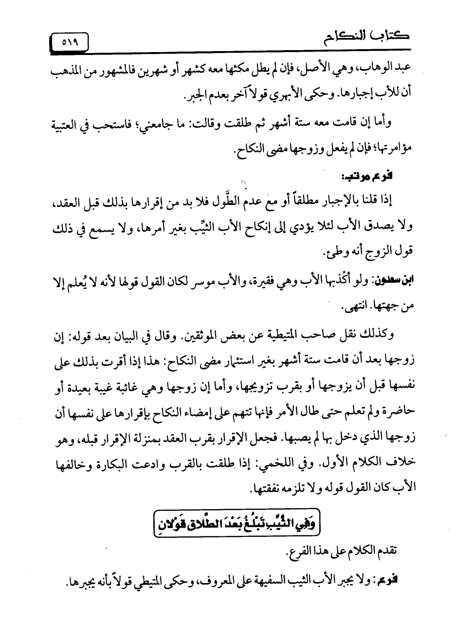 عبد الوهاب، وهي الأصل، فإن لم يطل مكثها معه كشهر أو شهرين فالمشهور من المذهب أن للأب إجبارها. وحكى الأبهري قولاً آخر بعدم الجبر.