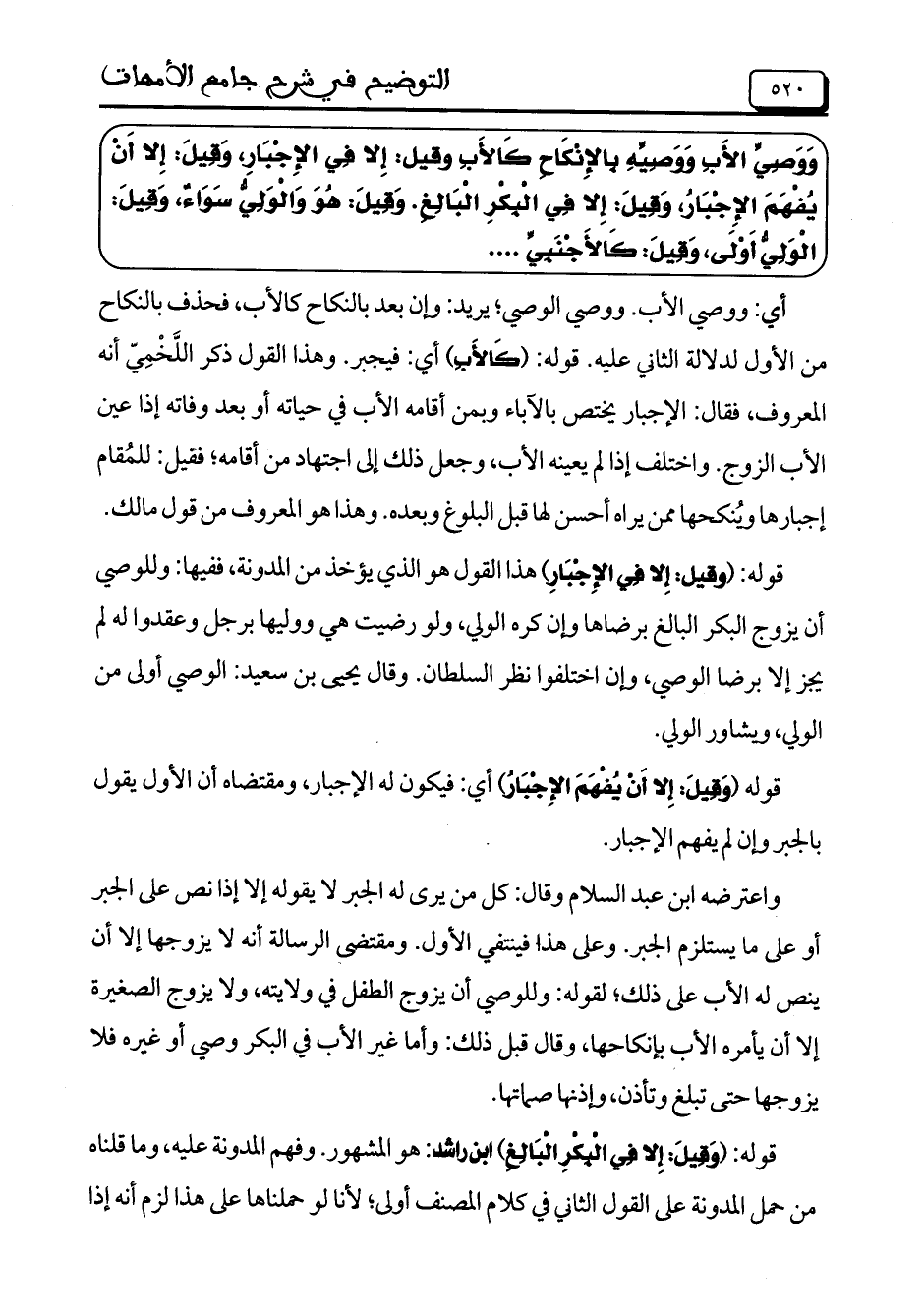 واعترضه ابن عبد السلام وقال: كل من يرى له الجبر لا يقوله إلا إذا نص على الجبر أو على ما يستلزم الجبر. وعلى هذا فينتفي الأول. ومقتضى الرسالة أنه لا يزوجها إلا أن ينص له الأب على ذلك؛ لقوله: وللوصي أن يزوج الطفل في ولايته، ولا يزوج الصغيرة إلا أن يأمره الأب بإنكاحها، وقال قبل ذلك: وأما غير الأب في البكر وصي أو غيره فلا يزوجها حتى تبلغ وتأذن، وإذنها صماتها.