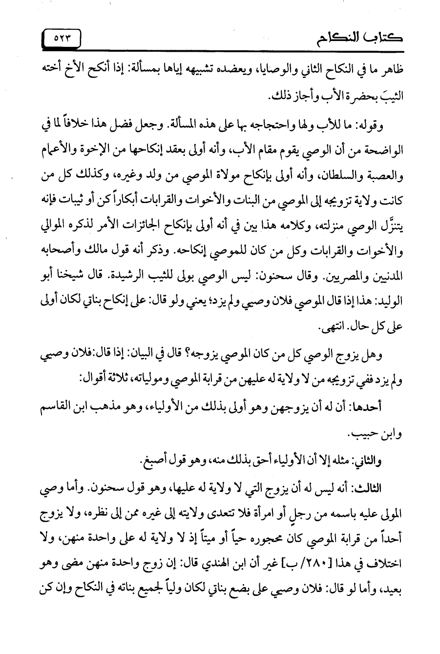 وقوله: ما للأب ولها واحتجاجه بها على هذه المسألة. وجعل فضل هذا خلافاً لما في الواضحة من أن الوصي يقوم مقام الأب، وأنه أولى بعقد إنكاحها من الإخوة والأعمام والعصبة والسلطان، وأنه أولى بإنكاح مولاة الموصي من ولد وغيره، وكذلك كل من كانت ولاية تزويجه إلىلموصي من البنات والأخوات والقرابات أبكاراً كن أو ثيبات فإنه يتنزل الوصي منزلته، وكلامه هذا بين في أنه أولى بإنكاح الجائزات الأمر لذكره الموالي والأخوات والقرابات وكل من كان للموصي إنكاحه. وذكر أنه قول مالك وأصحابه والأخوات والقرابات وكل من كان للموصي إنكاحه. وذكر أنه قول مالك وأصحابه المدنيين والمصريين. وقال سحنون: ليس الوصي بولي للثيب الرشيدة. قال شيخنا أبو الوليد: هذا إذا قال الموصي فلان وصيي ولم يزد؛ يعني ولو قال: على إنكاح بناتي لكان أولى على كل حال. انتهى.