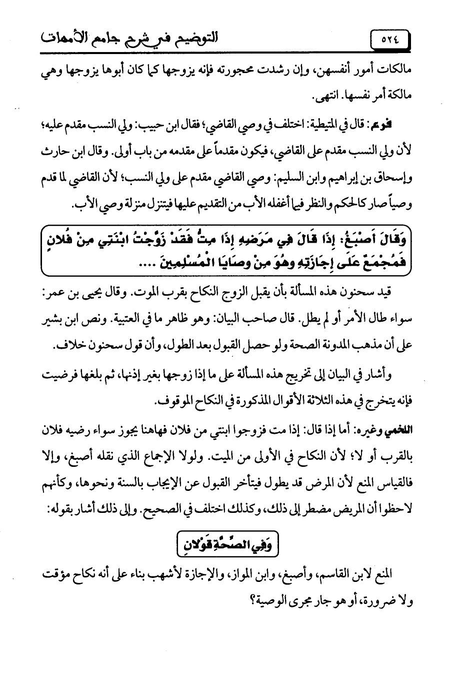 وَقَالَ أَصْبَغُ: إِذَا قَالَ فِي مَرَضِهِ إِذَا مِتُّ فَقَدْ زَوَّجْتُ ابْنَتِي مِنْ فُلانٍ فَمُجْمَعُ عَلَى إِجَازَتِهِ وهُوَ مِنْ وصَايَا الْمُسْلِمينَ ....