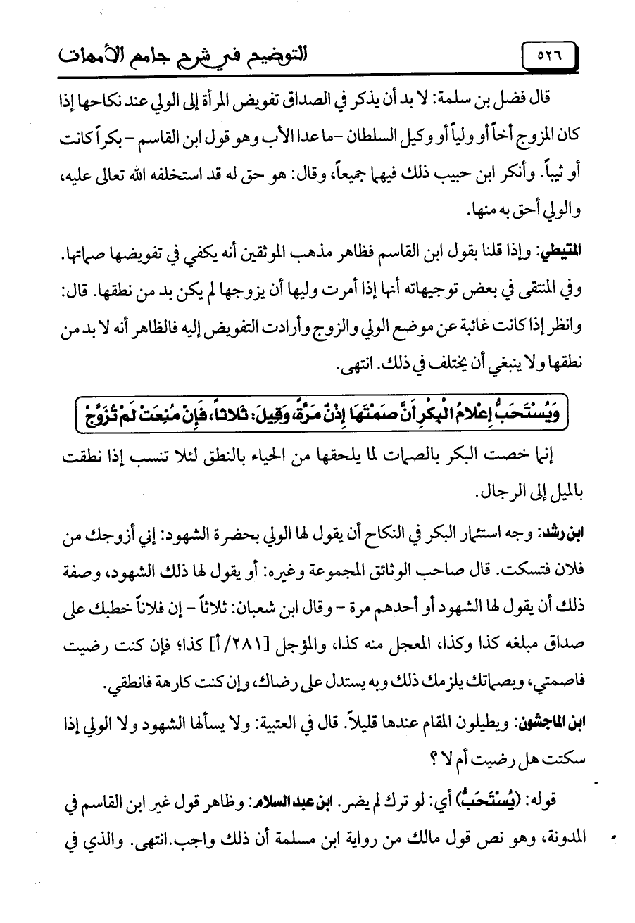 ابن رشد: وجه استئمار البكر في النكاح أن يقول لها الولي بحضرة الشهود: إني أزوجك من فلان فتسكت. قال صاحب الوثائق المجموعة وغيره: أو يقول لها ذلك الشهود، وصفة ذلك أن يقول لها ذلك الشهود، وصفة ذلك أن يقول لها الشهود أو أحدهم مرة- وقال ابن شعبان: ثلاثاً- إن فلاناً خطبك على صداق مبلغه كذا وكذا، المعجل منه كذا، والمؤجل [281/ أ] كذا؛ فإن كنت رضيت فاصمتي، وبصماتك يلزمك ذلك وبه يستدل على رضاك، وإن كنت كارهة فانطقي.