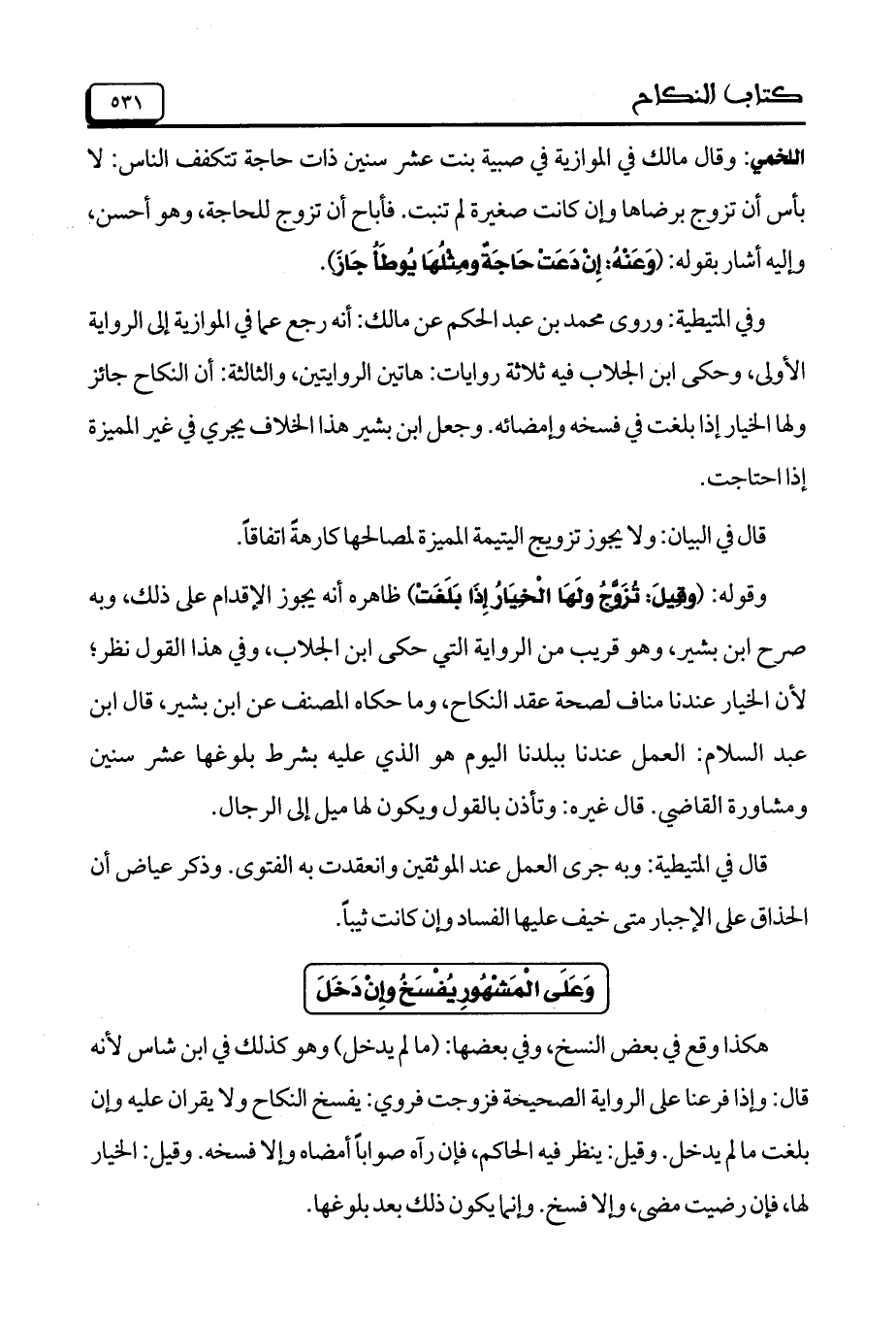 وفي المتيطية: وروى محمد بن عبد الحكم عن مالك: أنه رجع عما في الموازية إلى الرواية الأولى، وحكى ابن الجلاب فيه ثلاثة روايات: هاتين الروايتين، والثالثة: أن النكاح جائز ولها الخيار إذا بلغت في فسخه وإمضائه. وجعل ابن بشير هذا الخلاف يجري في غير المميزة إذا احتاجت.