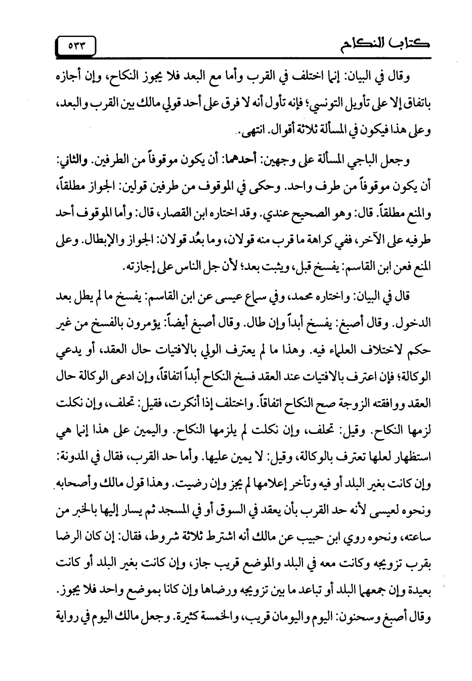 وقال في البيان: إنما اختلف في القرب وأما مع البعد فلا يجوز النكاح، وإن أجازه باتفاق إلا على تأويل التونسي؛ فإنه تأول أنه لا فرق على أحد قولي مالك بين القرب والبعد، وعلى هذا فيكون في المسألة ثلاثة أقوال. انتهى.