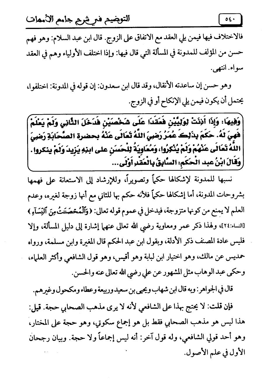 وَفِيهَا: وَإِذَا أَذِنَتْ لِوَلِيَّيْنِ فَعَقَدَا عَلَى شَخْصَيْنِ فَدَخَلَ الثَّانِي وَلَمْ يَعْلَمْ فَهِيَ لَهُ. حَكَمَ بِذَلِكَ عُمَرُ رَضِيَ اللهُ تَعَالَى عَنْهُ بحضرة الصَّحَابَةِ رَضِيَ اللهُ تَعَالَى عَنْهُمْ وَلَمْ يُنْكِرُوا، وَمُعَاوِيَةُ لِلْحَسَنِ عَلَى ابنِهِ يَزِيدَ وَلَمْ ينكروا وَقَالَ ابْنُ عبد الْحَكَمِ: السَّابِقُ بِالْعَقْدِ أَوْلَى ....