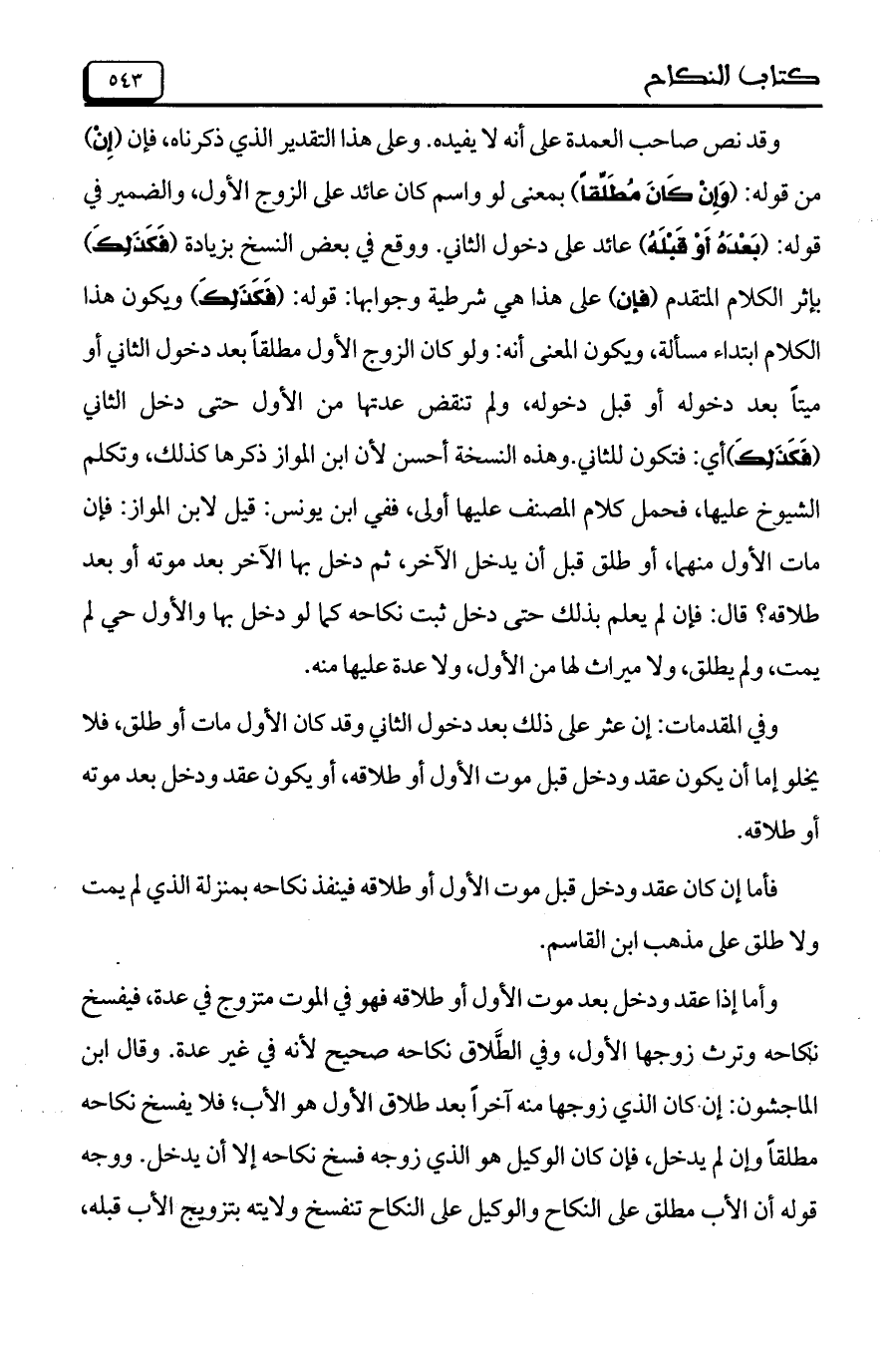 وقد نص صاحب العمدة على أنه لا يفيده. وعلى هذا التقدير الذي ذكرناه، فإن (إِنْ) من قوله: (وَإِنْ كَانَ مُطَلِّقاً) بمعنى لو واسم كان عائد على الزوج الأول، والضمير في قوله: (بَعْدَهُ أَوْ قَبْلَهُ) عائد على دخول الثاني. ووقع في بعض النسخ بزيادة (فَكَذَلِكَ) بإثر الكلام المتقدم (فإن) على هذا هي شرطية وجوابها: قوله: (فَكَذَلِكَ) ويكون هذا الكلام ابتداء مسألة، ويكون المعنى أنه: ولو كان الزوج الأول مطلقاً بعد دخول الثاني أو ميتاً بعد دخوله أو قبل دخوله، ولم تنقض عدتها من الأول حتى دخل الثاني (فَكَذَلِكَ) أي: فتكون للثاني. وهذه النسخة أحسن لأن ابن المواز ذكرها كذلك، وتكلم الشيوخ عليها، فحمل كلام المصنف عليها أولى، ففي ابن يونس: قيل لابن المواز: فإن مات الأول منهما، أو طلق قبل أن يدخل الآخر، ثم دخل بها الآخر بعد موته أو بعد طلاقه؟ قال: فإ، لم يعلم بذلك حتى دخل ثبت نكاحه كما لو دخل بها والأول حي لم يمت، ولم يطلق، ولا ميراث لها من الأول، ولا عدة عليها منه.