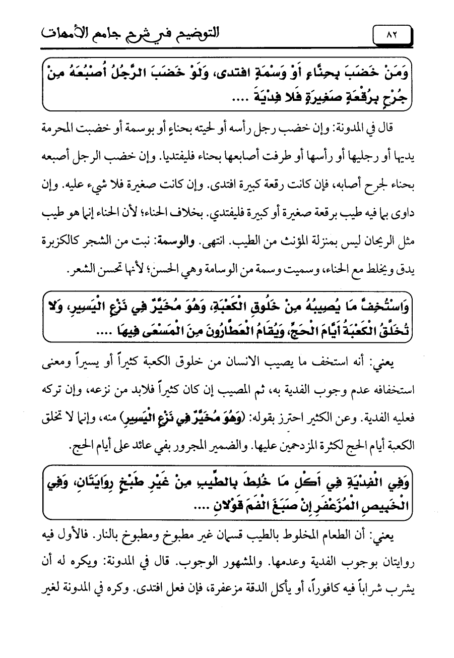 قال في المدونة: وإن خضب رجل رأسه أو لحيته بحناء أو بوسمة أو خضبت المحرمة يديها أو رجليها أو رأسها أو طرفت أصابعها بحناء فليفتديا. وإن خضب الرجل أصبعه بحناء لجرح أصابه، فإن كانت رقعة كبيرة افتدى. وإن كانت صغيرة فلا شيء عليه. وإن داوي بما في طيب برقعة صغيرة أو كبيرة فليفتدى. بخلاف الحناء؛ لأن الحناء إنما هو طيب مثل الريحان ليس بمنزلة المؤنث من الطيب. انتهى. والوسمة: نبت من الشجر كالكزبرة يدق ويخلط مع الحناء، وسميت وسمة من الوسامة وهي الحسن؛ لأنها تحسن الشعر.