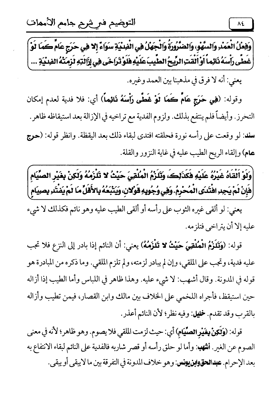 سند: لو وقعت على رأسه نورة فحلقته افتدى لبقاء ذلك بعد اليقظة. وانظر قوله: (حرج عام) وإلقاء الريح الطيب عليه في غاية النزور والقلة.