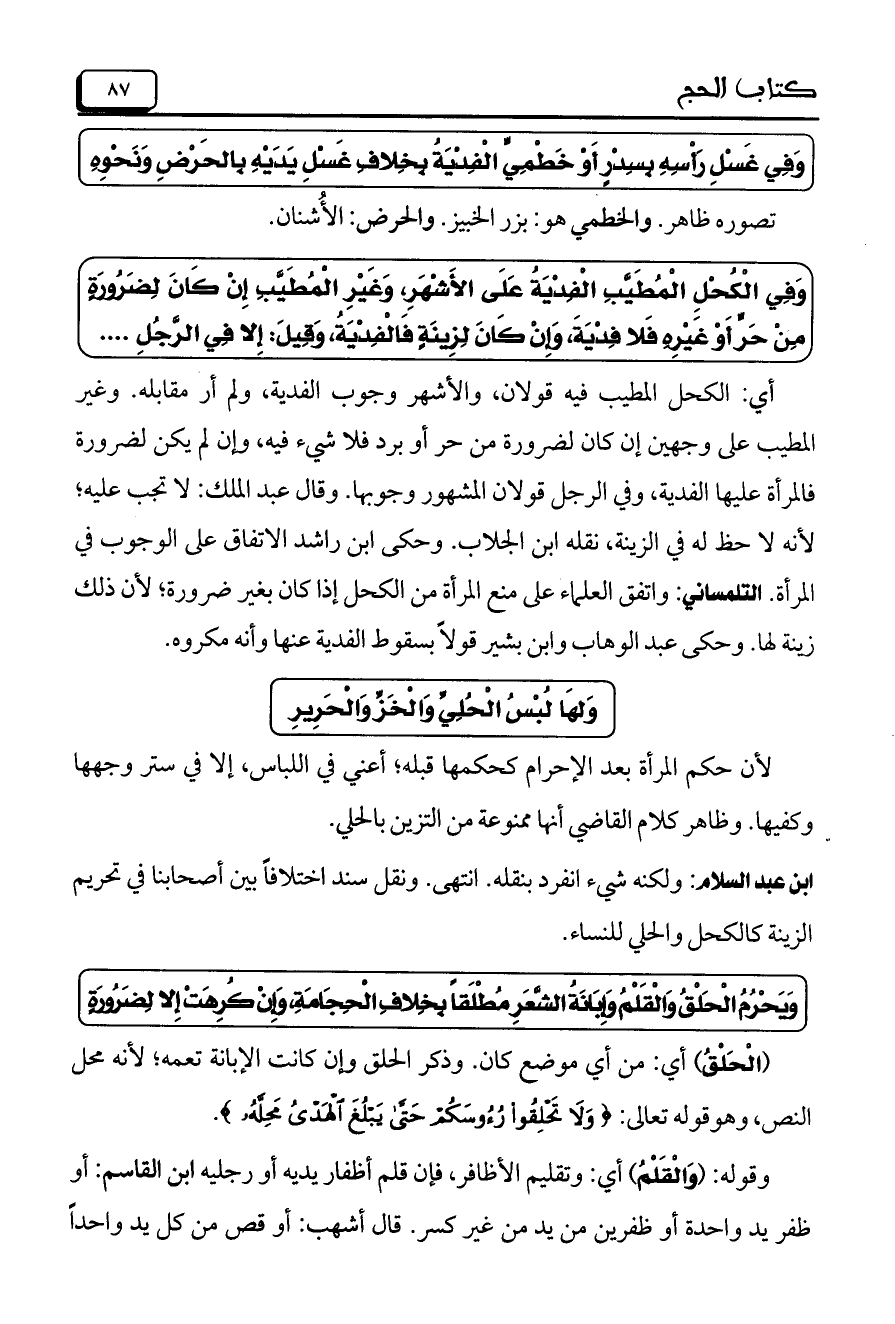وَفِي الْكُحْلِ الْمُطَيَّبِ الْفِدْيَةُ عَلَى الأَشْهَرِ، وَغَيْرِ الْمُطَيَّبِ إِنْ كَانَ لِضَرُورَةٍ مِنْ حَرٍّ أَوْ غَيْرِهِ فَلا فِدْيَةَ، وَإِنْ كَانَ لِزِينَةٍ فَالْفِدْيَةُ، وَقِيلَ: إِلا فِي الرَّجُلِ ....