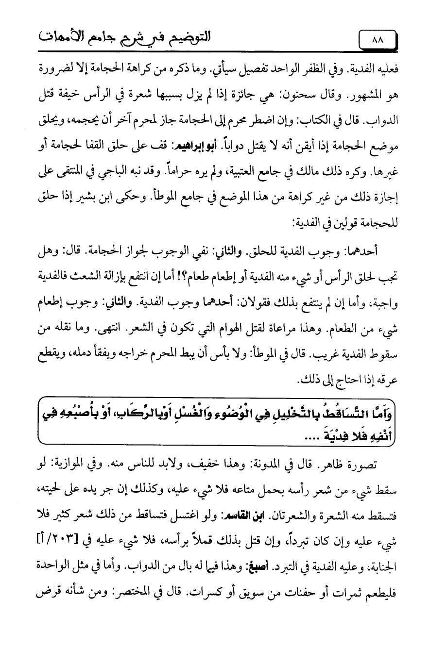 فعليه الفدية. وفي الظفر الواحد تفصيل سيأتي. وما ذكره من كراهة الحجامة إلا لضرورة هو المشهور. وقال سحنون: هي جائزة إذا لم يزل بسببها شعرة في الرأس خيفة قتل الدواب. قال في الكتاب: وإن اضطر محرم إلى الحجامة جاز لمحرم آخر أن يحجمه، ويحلق موضع الحجامة إذا أيقن أنه لا يقتل دواباً. أبو إبراهيم: قف على حلق القفا لحجامة أو غيرها. وكره ذلك مالك في جامع العتيبة، ولم يره حراما. وقد نبه الباجي في المنتقى على إجازة ذلك من غير كراهة من هذا الموضع في جامع الموطأ. وحكى ابن بشير إذا حلق للحجامة قولين في الفدية: