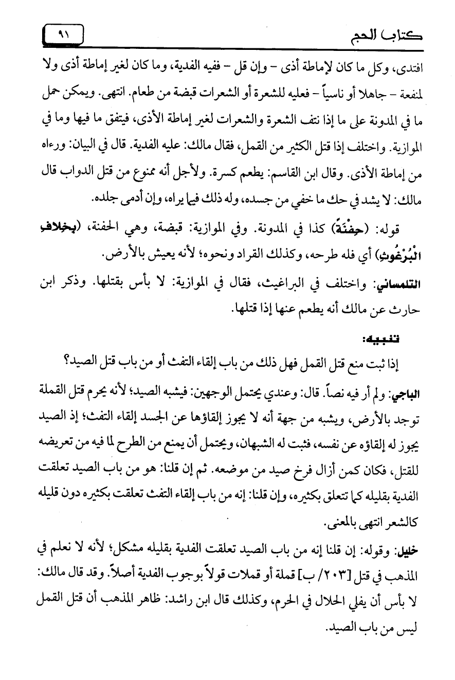 خليل: وقوله: إن قلنا إنه من باب الصيد تعلقت الفدية بقليله مشكل؛ لأنه لا نعلم في المذهب في قتل [203/ب] قملة أو قملات قولاً بوجوب الفدية أصلاً. وقد قال مالك: لا بأس أن يفلي الحلال في الحرم، وكذلك قال ابن راشد: ظاهر المذهب أن قتل القمل ليس من باب الصيد.