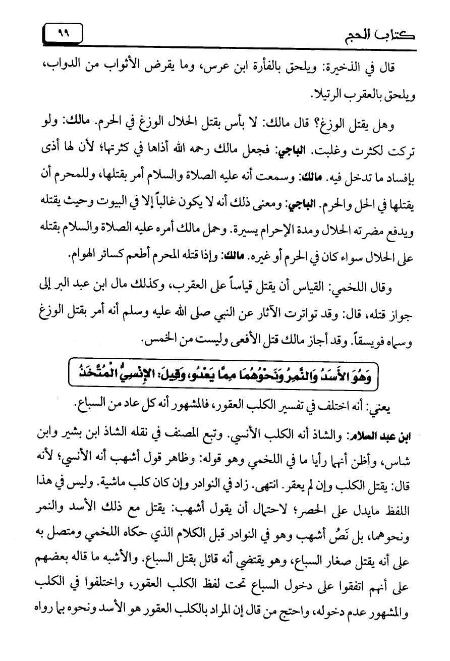 ابن عبد السلام: والشاذ أنه الكلب الأنسي. وتبع المصنف في نقله الشاذ ابن بشير وابن شاس، وأظن أنهما رأيا ما في اللخمي وهو قوله: وظاهر قول أشهب أنه الأنسي؛ لأنه قال: يقتل الكلب وإن لم يعقر. انتهى. زاد في النوادر وإن كان كلب ماشية. وليس في هذا اللفظ ما يدل على الحصر؛ لاحتمال أن يقول أشهب: يقتل مع ذلك الأسد والنمر ونحوهما، بل نص أشهب وهو في النوادر قبل الكلام الذي حكاه اللخمي ومتصل به على أنه يقتل صغار السباع، وهو يقتضي أنه قائل بقتل السباع. والأشبه ما قاله بعضهم على أنهم اتفقوا على دخول السباع تحت لفظ الكلب العقور، واختلفوا في الكلب والمشهور عدم دخوله، واحتج من قال إن المراد بالكلب العقور هو الأسد ونحوه بما رواه