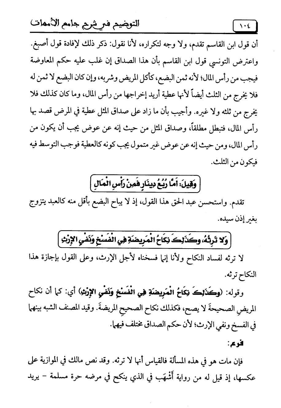 واعترض التونسي قول ابن القاسم بأن هذا الصداق إن غلب عليه حكم المعارضة فيجب من رأس المال؛ لأنه ثمن الفسح، كأكل المريض وشربه، وإن كان البضع لا ثمن له فلا يخرج من الثلث أيضاً لأنها عطية أريد إخراجها من رأس المال، وما كان كذلك فلا يخرج من ثلثه ولا ضره. وأجيب بأن ما زاد على صداق المثل عطية في المرض قصد بها رأس المال، فتبطل مطلقاً، وصداق المثل من حيث إنه عن عوض يجب أن يكون من رأس المال، ومن حيث إنه عن عوض متمول يجب كونه كالعطية فوجب التوسط فيه فيكون من الثلث.