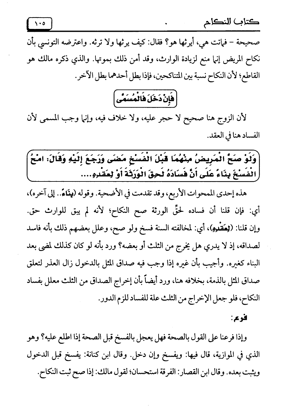 هذه إحدى الممحوات الأربع، وقد تقدمت في الأضحية. وقوله (بِنَاءً .. إلى آخره)، أي: فإن قلنا أن فساده لحقِّ الورثة صح النكاح؛ لأنه لم يبق للوارث حق. وإن قلنا (لِعَقْدِهِ)، أي: لمخالفته الستة فسخ ولو صح، وعلل بعضهم ذلك بأنه فاسد لصداقه، إذ لا يدري هل يخرج من الثلث أو يعضه؟ ورد بأنه لو كان كذلك لمضى بعد البناء كغيره. وأجيب بأن غيره إذا وجب فيه صداق المثل بالدخول زال العذر لتعلق صداق المثل بالذمة، بخلافه هنا، ورد أيضاً بأن إخراج الصداق من الثلث معلل بفساد النكاح، فلو جعل الإخراج من الثلث علة للفساد للزم الدور.