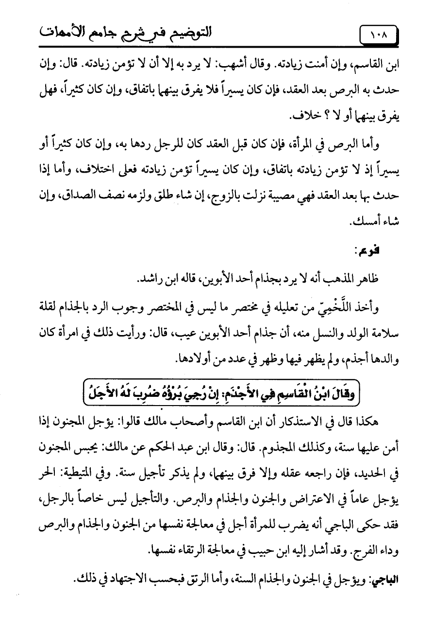 هكذا قال في الاستذكار أن ابن القاسم وأصحاب مالك قالوا: يؤجل المجنون إذا أمن عليها سنة، وكذلك المجذوم. قال: وقال ابن عبد الحكم عن مالك: يحبس المجنون في الحديد، فإن راجعه عقله وإلا فرق بينهما، ولم يذكر تأجيل سنة. وفي المتيطية: الحر يؤجل عاماً في الاعتراض والجنون والجذام والبرص. والتأجيل ليس خاصاً بالرجل، فقد حكى الباجي أنه يضرب للمرأة أجل في معالجة نفسها من الجنون والجذام والبرص وداء الفرج. وقد أشار إليه ابن حبيب في معالجة الرتقاء نفسها.