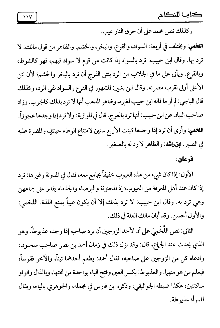 الأول: إذا كان شيء من هذه العيوب خفيفاً يجامع معه، فقال في المدونة وغيرها: ترد إذا كان عند أهل المعرفة من العيوب؛ إذ المجنونة والبرصاء والجذماء يقدر على جماعهن وهي ترد به. وقال ابن حبيب: لا ترد بذلك إلا أن يكون عيباً يمنع اللذة. اللخمي: والأول أحسن. وقد أبان مالك العلة في ذلك.