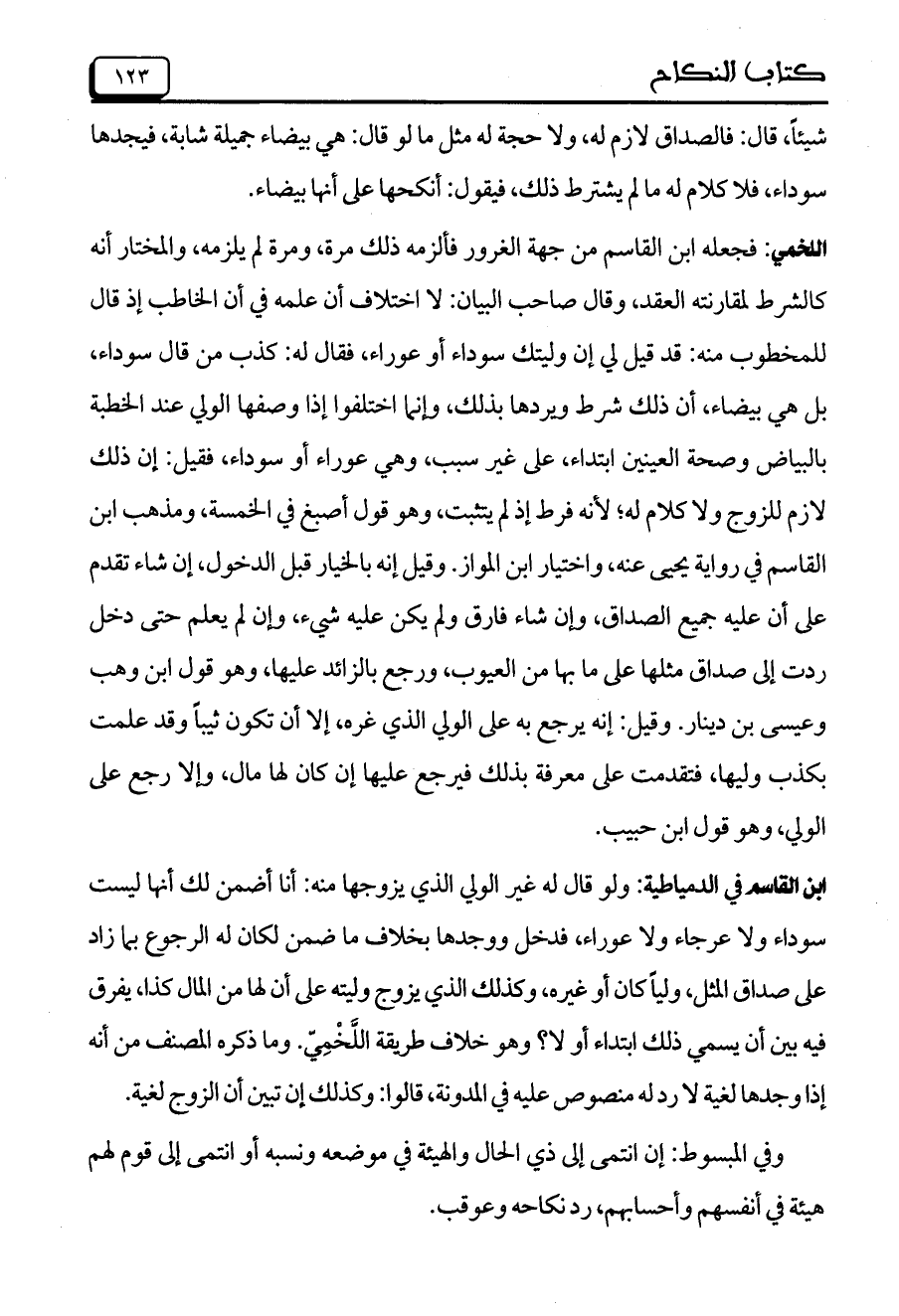 اللخمي: فجعله ابن القاسم من جهة الغرور فألزمه ذلك مرة، ومرة لم يلزمه، والمختار أنه كالشرط لمقارنته العقد، وقال صاحب البيان: لا اختلاف أن علمه في أن الخاطب إذ قال للمخطوب منه: قد قيل لي إن وليتك سوداء أو عوراء، فقال له: كذب من قال سوداء، بل هي بيضاء، أن ذلك شرط ويردها بذلك، وإنما اختلفوا إذا وصفها الولي عند الخطبة بالبياض وصحة العينين ابتداء، على غير سبب، وهي عوراء أو سوداء، فقيل: إن ذلك لازم للزوج ولا كلام له؛ لأنه فرط إذ لم يتثبت، وهو قول أصبغ في الخمسة، ومذهب ابن القاسم في رواية يحيى عنه، واختيار ابن المواز. وقيل إنه بالخيار قبل الدخول، إن شاء تقدم على أن عليه جميع الصداق، وإن شاء فارق ولم يكن عليه شيء، وإن لم يعلم حتى دخل ردت إلى صداق مثلها على ما بها من العيوب، ورجع بالزانئد عليها، وهو قول ابن وهب وعيسى بن دينار. وقيل: إنه يرجع به على الولي الذي غره، إلا أن تكون ثيباً وقد علمت بكذب وليها، فتقدمت على معرفة بذلك فيرجع عليها إن كان لها مال، وإلا رجع على الولي، وهو قول ابن حبيب.