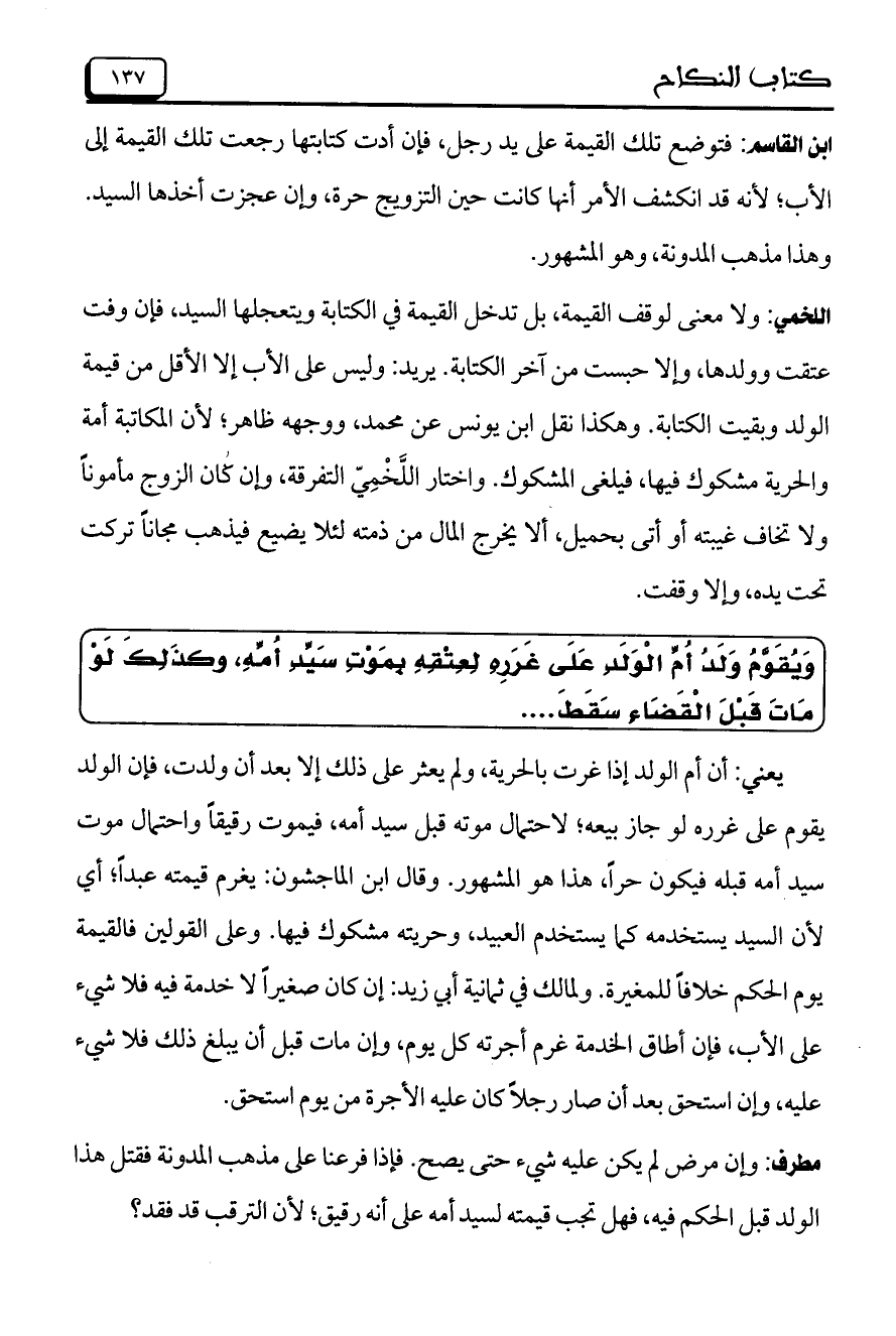 اللخمي: ولا معنى لوقف القيمة، بل تدخل القيمة في الكتابة ويتعجلها السيد، فإن وفت عتقت وولدها، وإلا حبست من آخر الكتابة. يريد: وليس على الأب إلا الأقل من قيمة الولد وبقيت الكتابة. وهكذا نقل ابن يونس عن محمد، ووجهه ظاهر؛ لأن المكاتبة أمة والحرية مشكوللا ك فيها، فيلغي المشكوك. واختار اللخمي التفرقة، وإن كان الزوج مأموناً ولا تخاف غيبته أو أتى بحميل، ألا يخرج المال من ذمته لئلا يضيع فيذهب مجاناً تركت تحت يده، وإلا وقفت.
