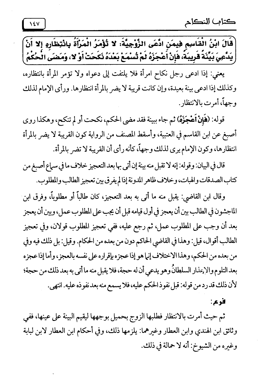 قَالَ ابْنُ الْقَاسِمِ فِيمَنِ ادَّعَى الزَّوْجِيَّةَ: لا تُؤْمَرُ الْمَرْأَةُ بِانْتِظَارِهِ إِلا أَنْ يَدَّعِيَ بَيِّنَةً قَرِيبَةً، فَإِنْ أَعْجَزَهُ لَمْ تُسْمَعْ بَعْدَهُ نَكَحَتْ أَوْ لا، وَمَضَى الْحُكْمُ