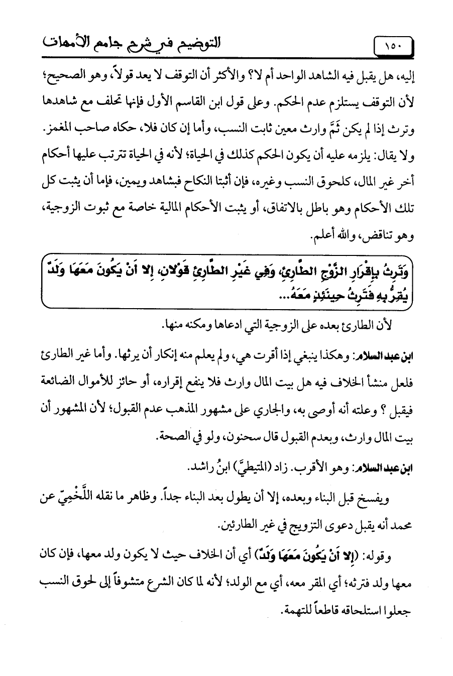وَتَرِثُ بِإِقْرَارِ الزَّوْجِ الطَّارِئِ، وَفِي غَيْرِ الطَّارِئِ قَوْلانِ، إِلا أَنْ يَكُونَ مَعَهَا وَلَدُ يُقِرُّ بِهِ فَتَرِثُ حِينَئِذٍ مَعَهُ ..