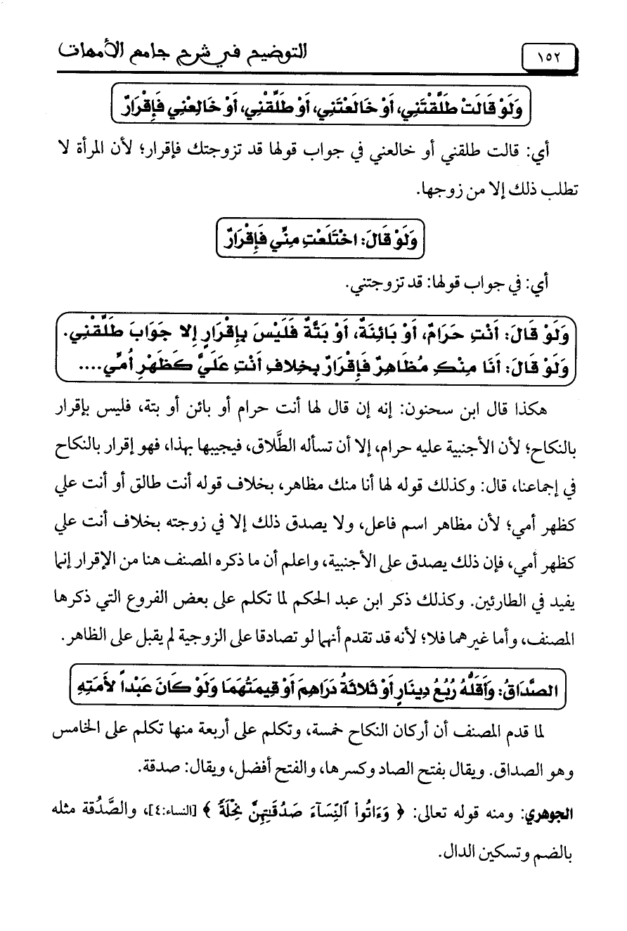هكذا قال ابن سحنون: إنه إن قال لها أنت حرام أو بائن أو بتة، فليس بإقرار بالنكاح؛ لأن الأجنبية عليه حرام، إلا أن تسأله الطلاق، فيجيبها بهذا، فهو إقرار بالنكاح في إجماعنا، قال: وكذلك قوله لها أنا منك مظاهر، بخلاف قوله أنت طالق أو أنت علي كظهر أمي؛ لأن مظاهر اسم فاعل، ولا يصدق ذلك إلا في زوجته بخلاف أنت علي كظهر أمي، فإن ذلك يصدق على الأجنبية، واعلم أن ما ذكره المصنف هنا من الإقرار إنما يفيد في الطارئين. وكذلك ذكر ابن عبد الحكم لما تكلم على بعض الفروع التي ذكرها المصنف، وأما غيرهما فلا؛ لأنه قد تقدم أنهما لو تصادقا على الزوجية لم يقبل على الظاهر.
