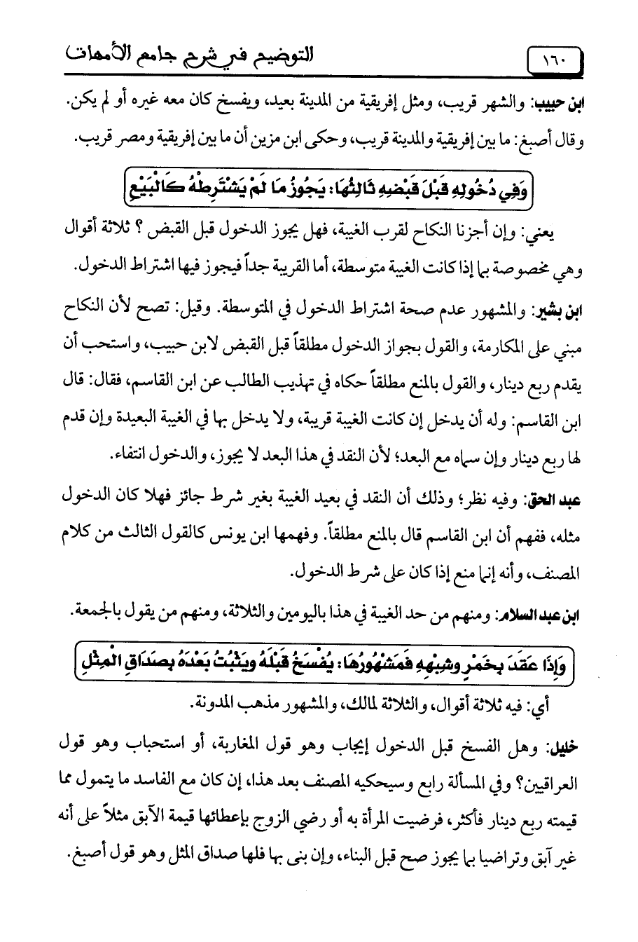 ابن بشير: والمشهور عدم صحة اشتراط الدخول في المتوسطة. وقيل: تصح لأن النكاح مبني على المكارمة، والقول بجواز الدخول مطلقاً قبل القبض لابن حبيب، واستحب أن يقدم ربع دينار، والقول بالمنع مطلقاً حكاه في تهذيب الطالب عن ابن القاسم، فقال: قال ابن القاسم: وله أن يدخل إن كانت الغيبة قريبة، ولا يدخل بها في الغيبة البعيدة وإن قدم لها ربع دينار وإن سماه مع البعد؛ لأن النقد في هذا البعد لا يجوز، والدخول انتفاء.