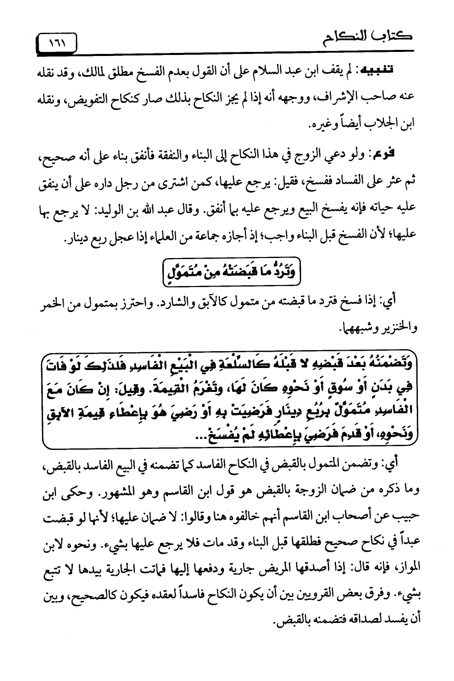 أي: وتضمن المتمول بالقبض في النكاح الفاسد كما تضمنه في البيع الفاسد بالقبض، وما ذكره من ضمان الزوجة بالقبض هو قول ابن القاسم وهو المشهور. وحكى ابن حبيب عن أصحاب ابن القاسم أنهم خالفوه هنا وقالوا: لا ضمان عليها؛ لأنها لو قبضت عبداً في نكاح صحيح فطلقها قبل البناء وقد مات فلا يرجع عليها بشيء. ونحوه لابن المواز، فإنه قال: إذا أصدقها المريض جارية ودفعها إليها فماتت الجارية بيدها لا تتبع بشيء. وفرق بعض القرويين بين أن يكون النكاح فاسداً لعقده فيكون كالصحيح، وبين أن يفسد لصداقه فتضمنه بالقبض.
