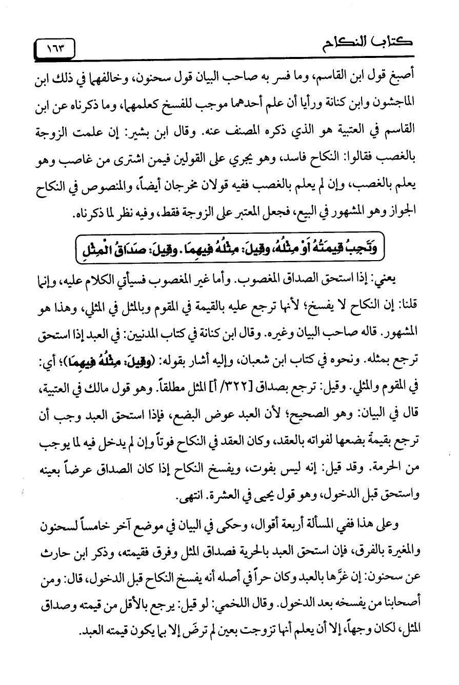 يعني: إذا استحق الصداق المغصوب. وأما غير المغصوب فسيأتي الكلام عليه، وإنما قلنا: إن النكاح لا يفسخ؛ لأنها ترجع عليه بالقيمة في المقوم وبالمثل في المثلي، وهذا هو المشهور. قاله صاحب البيان وغيره. وقال ابن كنانة في كتاب المدنيين: في العبد إذا استحق ترجع بمثله. ونحوه في كتاب ابن شعبان، وإليه أشار بقوله: (وقِيلَ: مِثْلُهُ فِيهِمَا)؛ أي: في المقوم والمثلي. وقيل: ترجع بصداق [322/ أ] المثل مطلقاً. وهو قول مالك في العتبية، قال في البيان: وهو الصحيح؛ لأن العبد عوض البضع، فإذا استحق العبد وجب أن ترجع بقيمة بضعها لفواته بالعقد، وكان العقد في النكاح فوتاً وإن لم يدخل فيه لما يوجب من الحرمة. وقد قيل: إنه ليس بفوت، ويفسخ النكاح إذا كان الصداق عرضاً بعينه واستحق قبل الدخول، وهو قول يحيى في العشرة. انتهى.