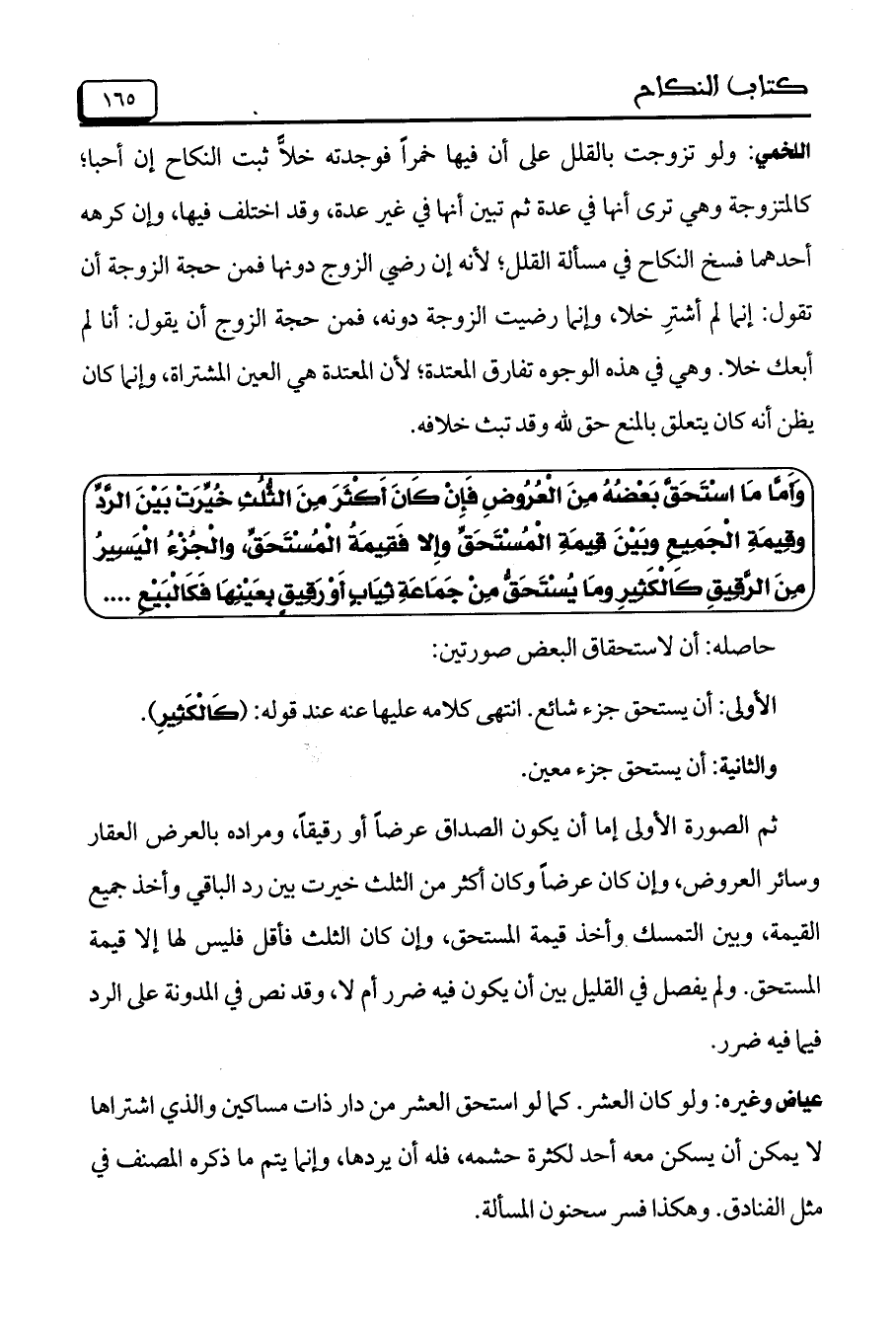 ثم الصورة الأولى إما أن يكون الصداق عرضاً أو رقيقاً، ومراده بالعرض العقار وسائر العروض، وإن كان عرضاً وكان أكثر من الثلث خيرت بين رد الباقي وأخذ جميع القيمة، وبين التمسك وأخذ قيمة المستحق، وإن كان الثلث فأقل فليس لها إلا قيمة المستحق. ولم يفصل في القليل بين أن يكون فيه ضرر أم لا، وقد نص في المدونة على الرد فيما فيه ضرر.