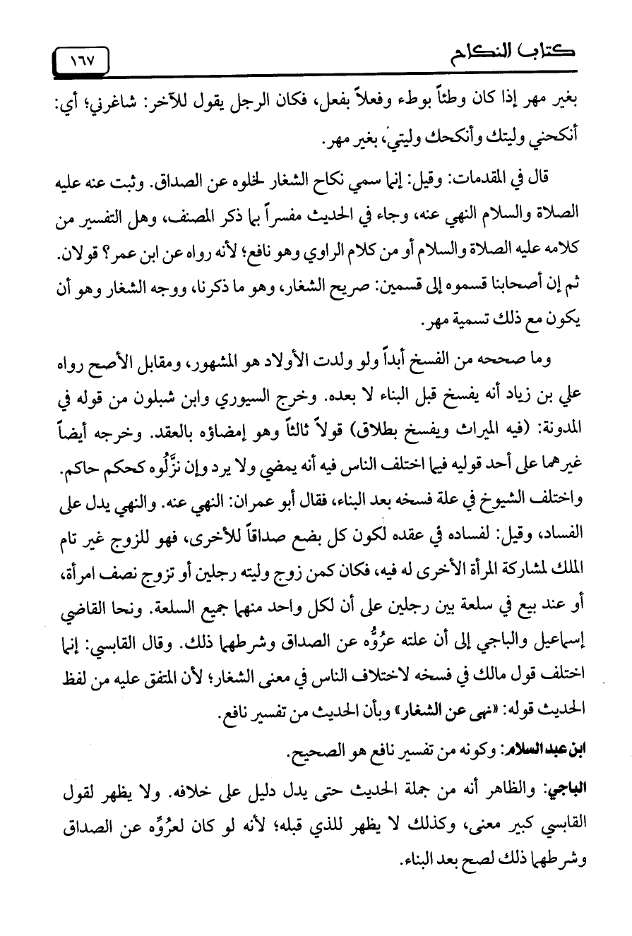 قال في المقدمات: وقيل: إنما سمي نكاح الشغار لخلوه عن الصداق. وثبت عنه عليه الصلاة والسلام النهي عنه، وجاء في الحديث مفسراً بما ذكر المصنف، وهل التفسير من كلامه عليه الصلاة والسلام أو من كلام الراوي وهو نافع؛ لأنه رواه عن ابن عمر؟ قولان. ثم إن أصحابنا قسموه إلى قسمين: صريح الشغار، وهو ما ذكرنا، ووجه الشغار وهو أن يكون مع ذلك تسمية مهر.