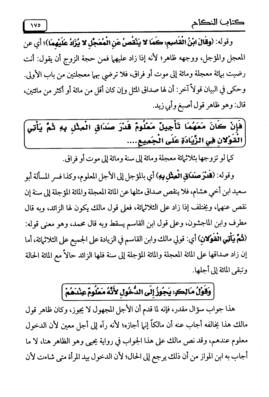 وقوله: (وقَالَ ابْنُ الْقَاسِمِ: كَمَا لا يَنْقُصُ عَنِ الْمُعَجَّلِ لا يُزَادُ عَلَيْهِمَا) أي عن المعجل والمؤجل، ووجهه ظاهر؛ لأنه إذا زاد عليهما فمن حجة الزوج أن يقول: أنت رضيت بمائة معجلة ومائة إلى موت أو فراق، فلا ترضي بهما معجلتين من باب الأولى. وحكى في البيان قولاً آخر: أن لها صداق المثل وإن كان أقل من مائة أو أكثر من مائتين، قال: وهو ظاهر قول أصبغ وأبي زيد.