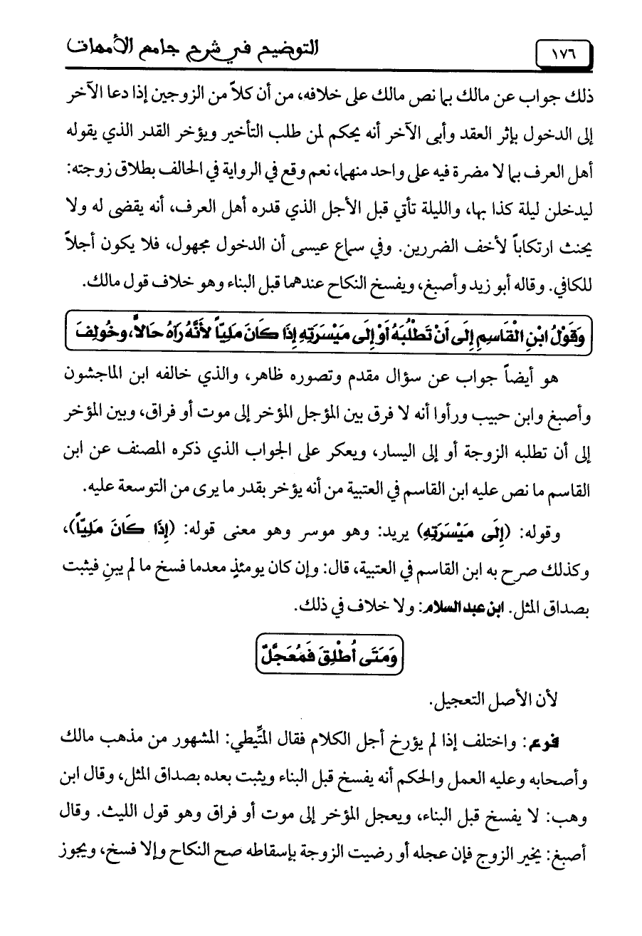 هو أيضاً جواب عن سؤال مقدم وتصوره ظاهر، والذي خالفه ابن الماجشون وأصبغ وابن حبيب ورأوا أنه لا فرق بين المؤجل المؤخر إلى موت أو فراق، وبين المؤخر إلى أن تطلبه الزوجة أو إلى اليسار، ويعكر على الجواب الذي ذكره المصنف عن ابن القاسم ما نص عليه ابن القاسم في العتبية من أنه يؤخر بقدر ما يرى من التوسعة عليه.