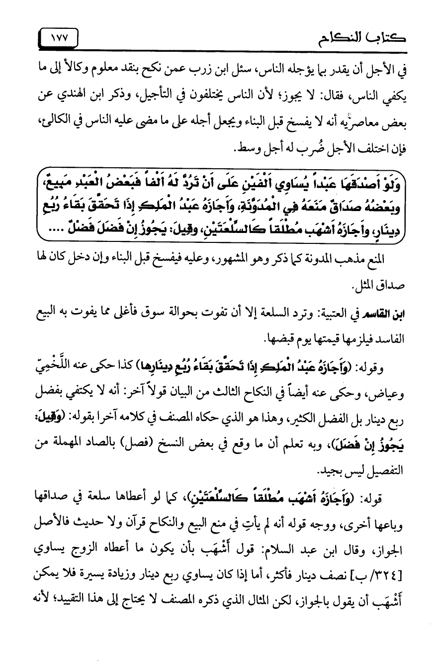 وقوله: (وَأَجَازَهُ عَبْدُ الْمَلِكِ إِذَا تَحَقَّقَ بَقَاءُ رُبُعِ دِينَارِها) كذا حكى عنه اللخمي وعياض، وحكى عنه أيضاً في النكاح الثالث من البيان قولاً آخر: أنه لا يكتفي بفضل ربع دينار بل الفضل الكثير، وهذا هو الذي حكاه المصنف في كلامه آخرا بقوله: (وقِيلَ: يَجُوزُ إِنْ فَضَلَ فَضْلُ)، وبه تعلم أن ما وقع في بعض النسخ (فصل) بالصاد المهملة من التفصيل ليس بجيد.