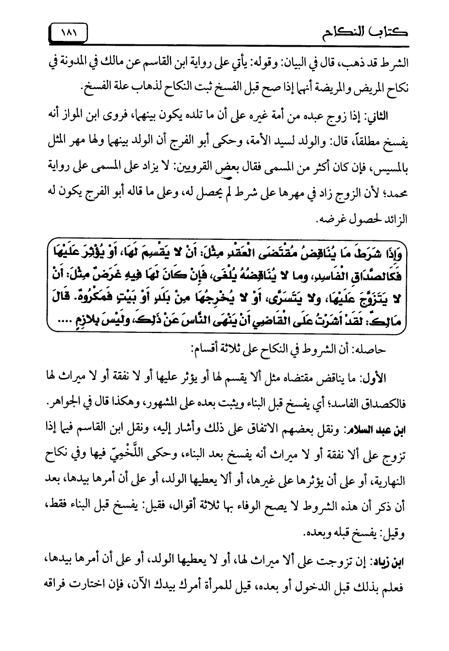 ابن عبد السلام: ونقل بعضهم الاتفاق على ذلك وأشار إليه، ونقل ابن القاسم فيما إذا تزوج على ألا نفقة أو لا ميراث أنه يفسخ بعد البناء، وحكى اللخمي فيها وفي نكاح النهارية، أو على أن يؤثرها على غيرها، أو ألا ي عطيها الولد، أو على أن أمرها بيدها، بعد أن ذكر أن هذه الشروط لا يصح الوفاء بها ثلاثة أقوال، فقيل: يفسخ قبل البناء فقط، وقيل: يفسخ قبله وبعده.