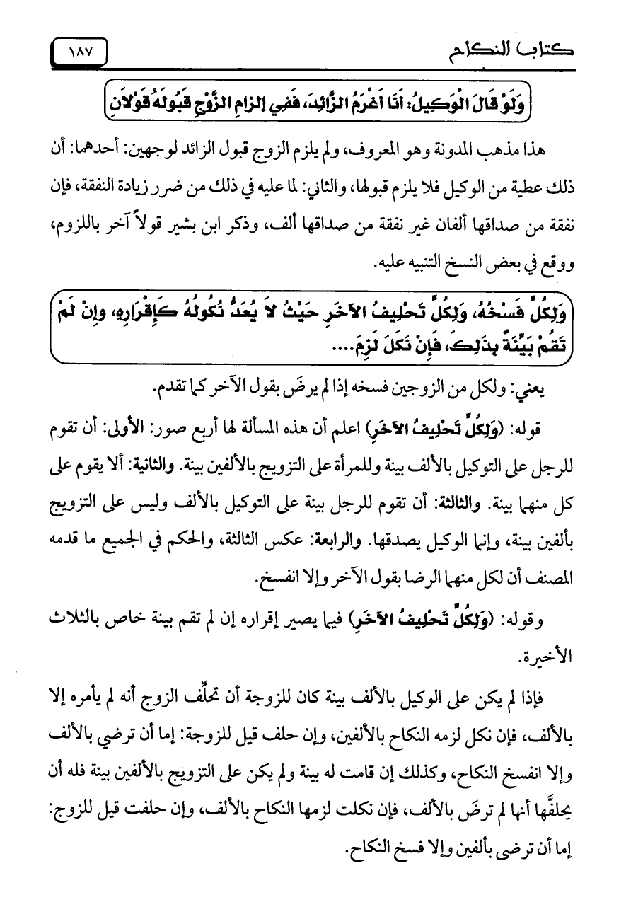 هذا مذهب المدونة وهو المعروف، ولم يلزم الزوج قبول الزائد لوجهين: أحدهما: أن ذلك عطية من الوكيل فلا يلزم قبولها، والثاني: لما عليه في ذلك من ضرر زيادة النفقة، فإن نفقة من صداقها ألفان غير نفقة من صداقها ألف، وذكر ابن بشير قولاً آخر باللزوم، ووقع في بعض النسخ التنبيه عليه.
