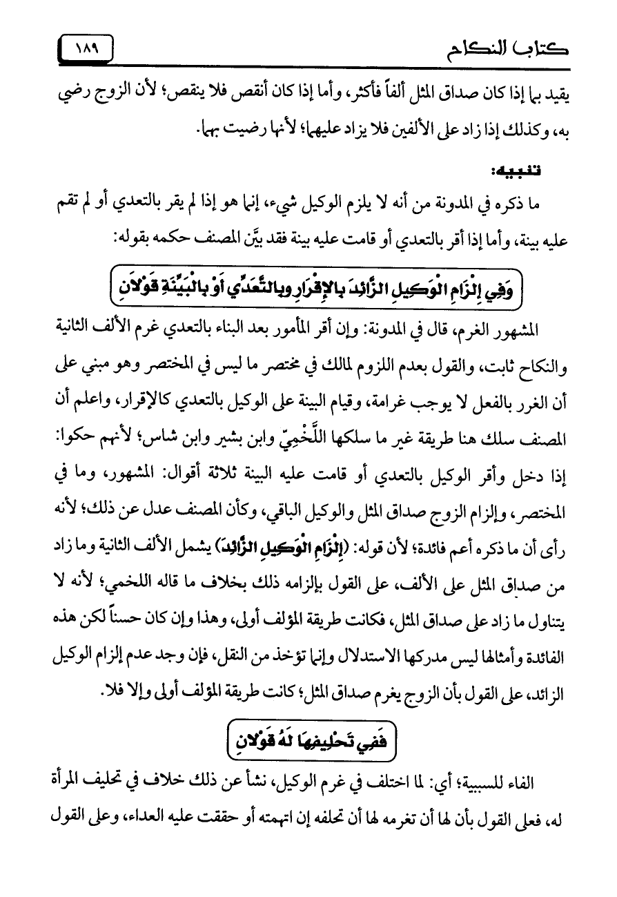 المشهور الغرم، قال في المدونة: وإن أقر المأمور بعد البناء بالتعدي غرم الألف الثانية والنكاح ثابت، والقول بعدم اللزوم لمالك في مختصر ما ليس في المختصر وهو مبني على أن الغرر بالفعل لا يوجب غرامة، وقيام البينة على الوكيل بالتعدي كالإقرار، واعلم أن المصنف سلك هنا طريقة غير ما سلكها اللخمي وابن بشير وابن شاس؛ لنهم حكوا: إذا دخل وأقر الوكيل بالتعدي أو قامت عليه البينة ثلاثة أقوال: المشهور، وما في المختصر، وإلزام الزوج صداق المثل والوكيل الباقي، وكأن المصنف عدل عن ذلك؛ لأنه رأى أن ما ذكره أعم فائدة؛ لأن قوله: (إِلْزَامِ الْوَكِيلِ الزَّائِدَ) يشمل الألف الثانية وما زاد من صداق المثل على الألف، على القول بإلزامه ذلك بخلاف ما قاله اللخمي؛ لأنه لا يتناول ما زاد على صداق المثل، فكانت طريقة المؤلف أولى، وهذا وإن كان حسناً لكن هذه الفائدة وأمثالها ليس مدركها الاستدلال وإنما تؤخذ من النقل، فإن وجد عدم إلزام الوكيل الزائد، على القول بأن الزوج يغرم صداق المثل؛ كانت طريقة المؤلف أولى وإلا فلا.